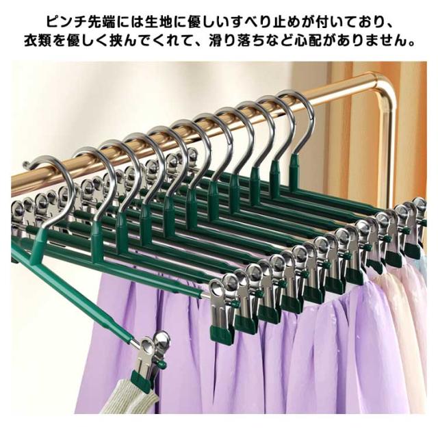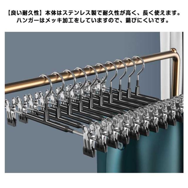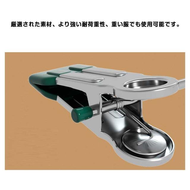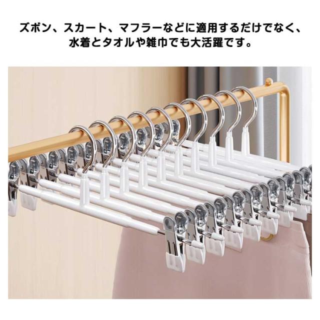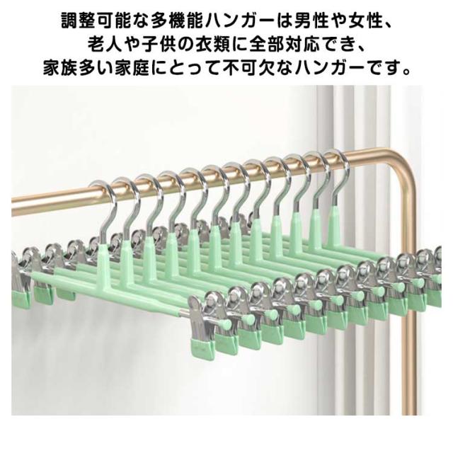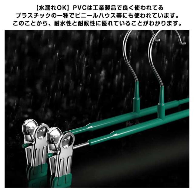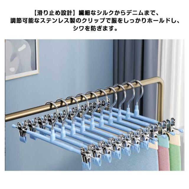 | 【滑り止め設計】繊細なシルクからデニムまで、調節可能なステンレス製のクリップで服をしっかりホールドし、シワを防ぎます。 ピンチ先端には生地に優しいすべり止めが付いており、衣類を優しく挟んでくれて、滑り落ちなど心配がありません。 ズボン、スカート、マフラーなどに適用するだけでなく、水着とタオルや雑巾でも大活躍です。 【良い耐久性】本体はステンレス製で耐久性が高く、長く使えます。ハンガーはメッキ加工をしていますので、錆びにくいです。 厳選された素材、より強い耐荷重性、重い服でも使用可能です。 【水濡れOK】PVCは工業製品で良く使われてるプラスチックの一種でビニールハウス等にも使われています。 このことから、耐水性と耐候性に優れていることがわかります。 【様々な場で活用】スカートハンガーの2つのクリップは左右に移動が可能なので、掛けたい物のサイズに合わせて調整できます。 調整可能な多機能ハンガーは男性や女性、老人や子供の衣類に全部対応でき、家族多い家庭にとって不可欠なハンガーです。 | |