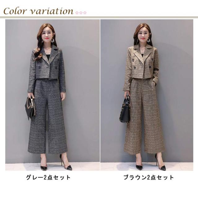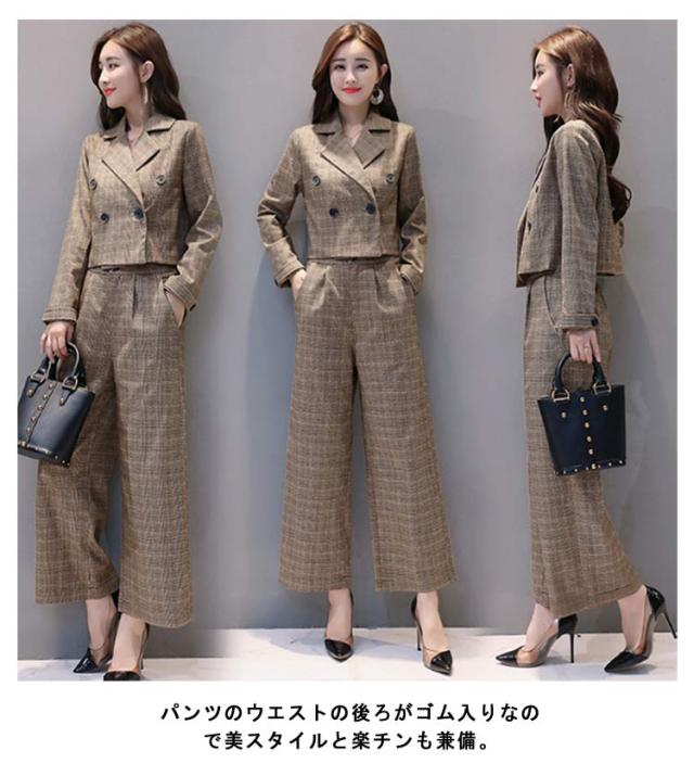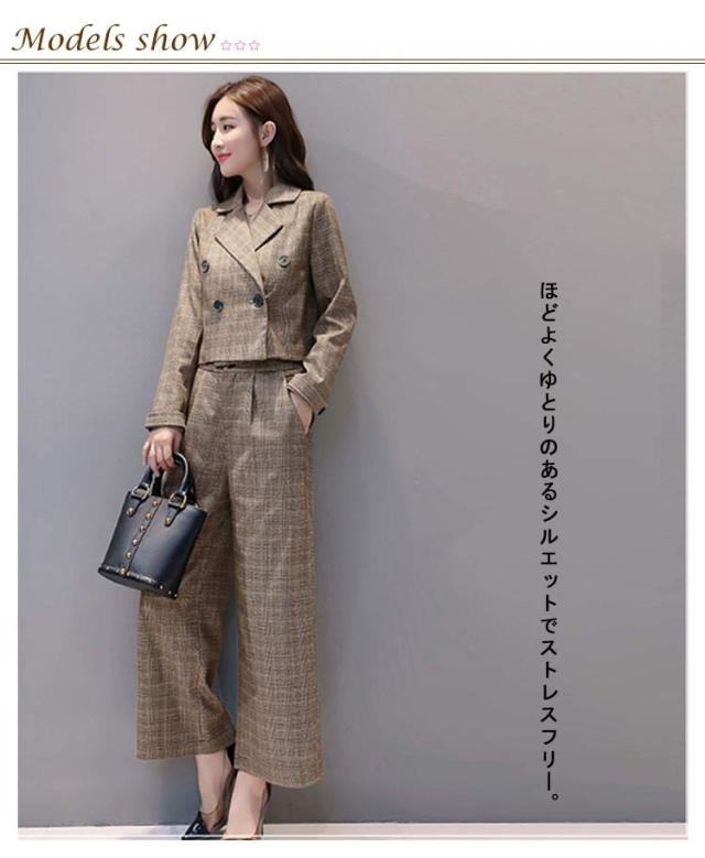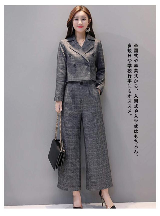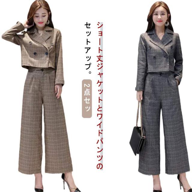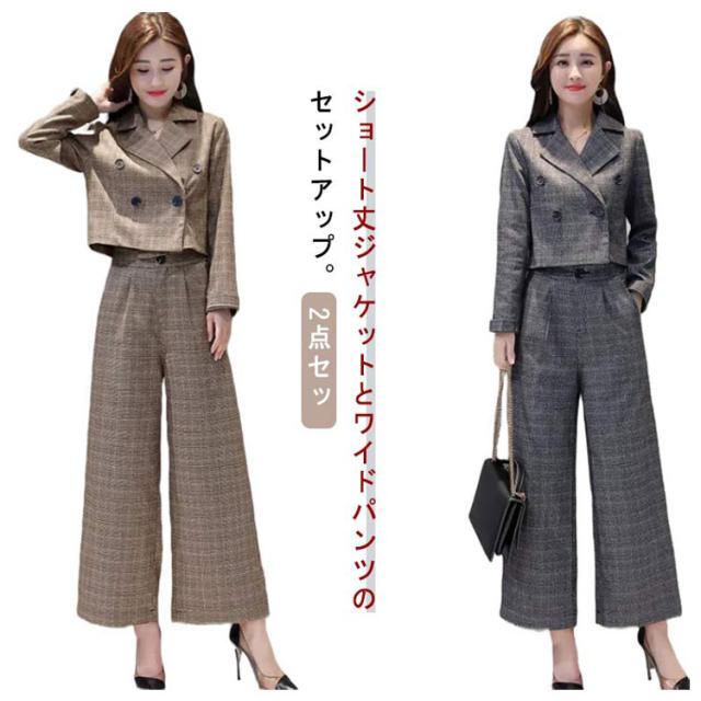 レディース 上下セット パンツドレス 2点セット パンツスーツ セットアップ 卒業式 上下 チェック柄 ワイドパンツ ジャケット ゆったり 卒業式 入園式 卒園式 セレモニー