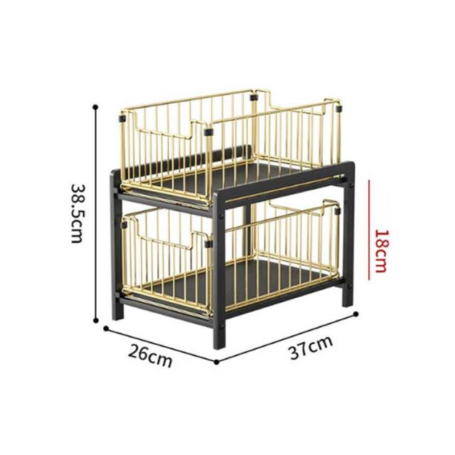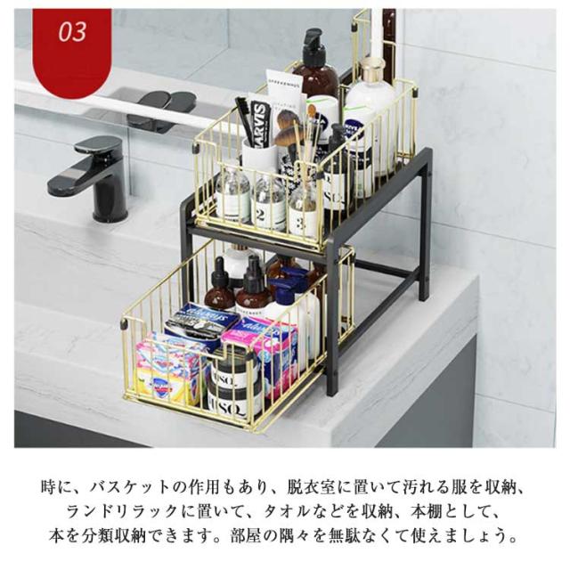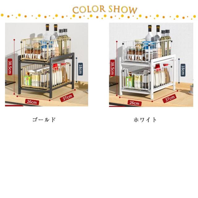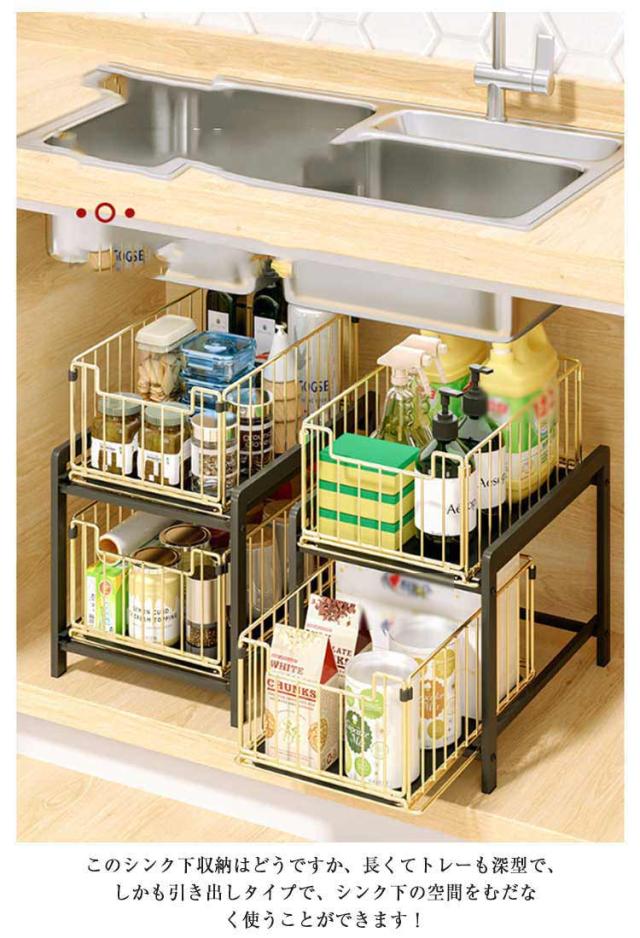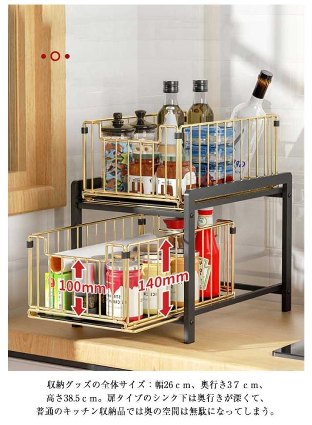 | 【シンク下の仲間、スライド式シンク下収納】キッチンの中でも収納に困りがちなのがシンク下、扉タイプだと水道管が通っていてスペースをいかせない、スライド式の収納用品を使ってシンク下の収納スペースを改造してみませんか。2段引き出し式で物の出し入れが便利、シート付きで収納物が落ちしません。大容量デザインでたっぷり収納、円弧デザインで使い安全、ゴム製足で家具に傷を与えません。さ、どうでしょうか、ちょっとした工夫をして、使いやすさは格段にアップ! 【大容量、シンク下の収納スペースを活用】収納グッズの全体サイズ:幅26cm、奥行き37cm、高さ38.5cm。扉タイプのシンク下は奥行きが深くて、普通のキッチン収納品では奥の空間は無駄になってしまう。このシンク下収納はどうですか、長くてトレーも深型で、しかも引き出しタイプで、シンク下の空間をむだなく使うことができます!背の高い調味料やスポンジやたわし、缶詰や洗剤類、袋物などを引き出しにどんどん収納しましょう。収納グッズを組み合わせれば、不便だったシンク下が快適に使える。 【引き出し式デザイン、高品質】焼付け塗装で錆びにくくので、お手入れは簡単になります。雑巾で拭くことも丸洗いことも可能。耐荷重 15 kg、ゴム製足で、滑りにくく家具にキズも付けません。2段引き出しデザインでシンク下に置きても引きのみで中の収納物を簡単に取り出します。2個引き出しがあるこそ、分類収納できます。上段はスポンジやたわし、手袋などのストック、下段は洗剤類のパウチタイプの詰替えストックを入れています。 【幅広く使え、便利】幅が狭いラックで排水管を完璧に避けることができるので、幅広く使えます!シンク下収納として、キッチンや洗面台下に大活躍。スプレーボトルや体用洗剤、調味料や調味道具などのを収納できます。時に、バスケットの作用もあり、脱衣室に置いて汚れる服を収納、ランドリラックに置いて、タオルなどを収納、本棚として、本を分類収納できます。部屋の隅々を無駄なくて使えましょう。 | |