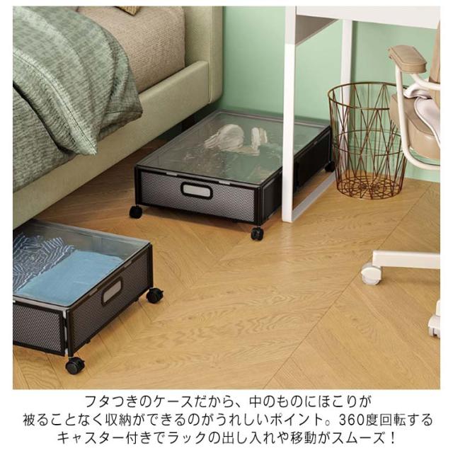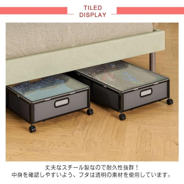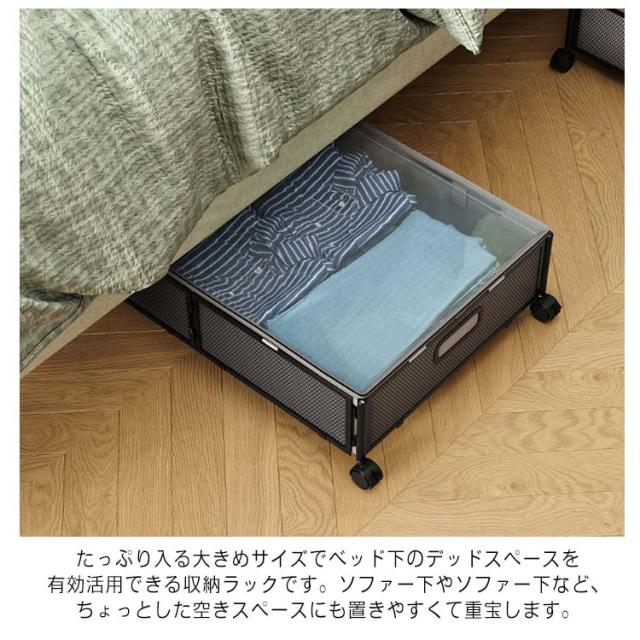 | 布製カバー付き!キャスター付きベッド下収納ボックス。 丈夫なスチール製なので耐久性抜群! 中身を確認しやすいよう、フタは透明の素材を使用しています。 フタつきのケースだから、中のものにほこりが被ることなく収納ができるのがうれしいポイント。 360度回転するキャスター付きでラックの出し入れや移動がスムーズ! 衣替え用や模様替え用などに活躍します。 しっかりしたスチール製ラックなので、タオルや衣類の収納だけでなく、コミック、CD、本の収納にもおすすめです! たっぷり入る大きめサイズでベッド下のデッドスペースを有効活用できる収納ラックです。 ソファー下やソファー下など、ちょっとした空きスペースにも置きやすくて重宝します。 使用しないときはコンパクトに折りたためるため、収納に場所を取りません。 | |