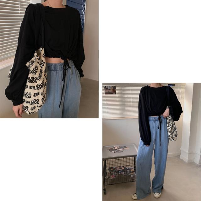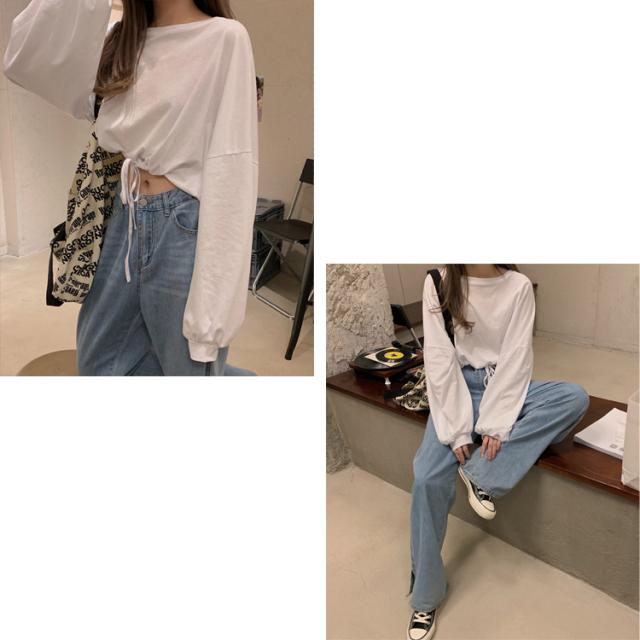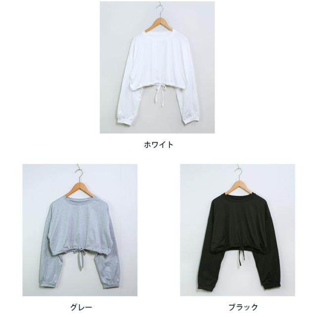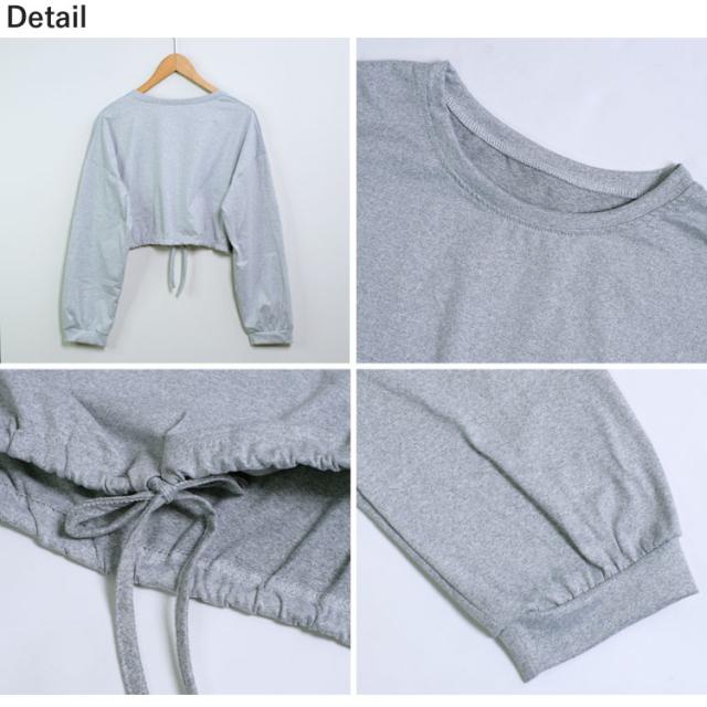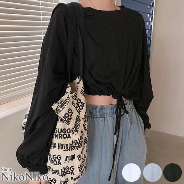 全品送料無料一部除く クロップド丈 裾絞りスウェットma 【即納】ショート丈 ミニ丈 長袖 トップス ロングTシャツ トレーナー フロントリボン 裾ドロスト ボリューム袖 無地 レディース 韓国 プチプラ 流行り トレンド 人気 おすすめ おしゃれ かわいい シンプル