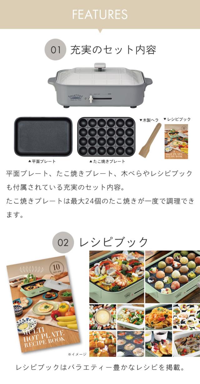 | ・平面プレート ・たこ焼きプレート ・木製ヘラ ・レシピブック |