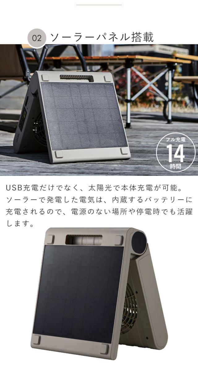 2022年に発売されたソーラーパワーファンが防水仕様・風量アップ・USB PD対応で急速充電/給電に改良されました。