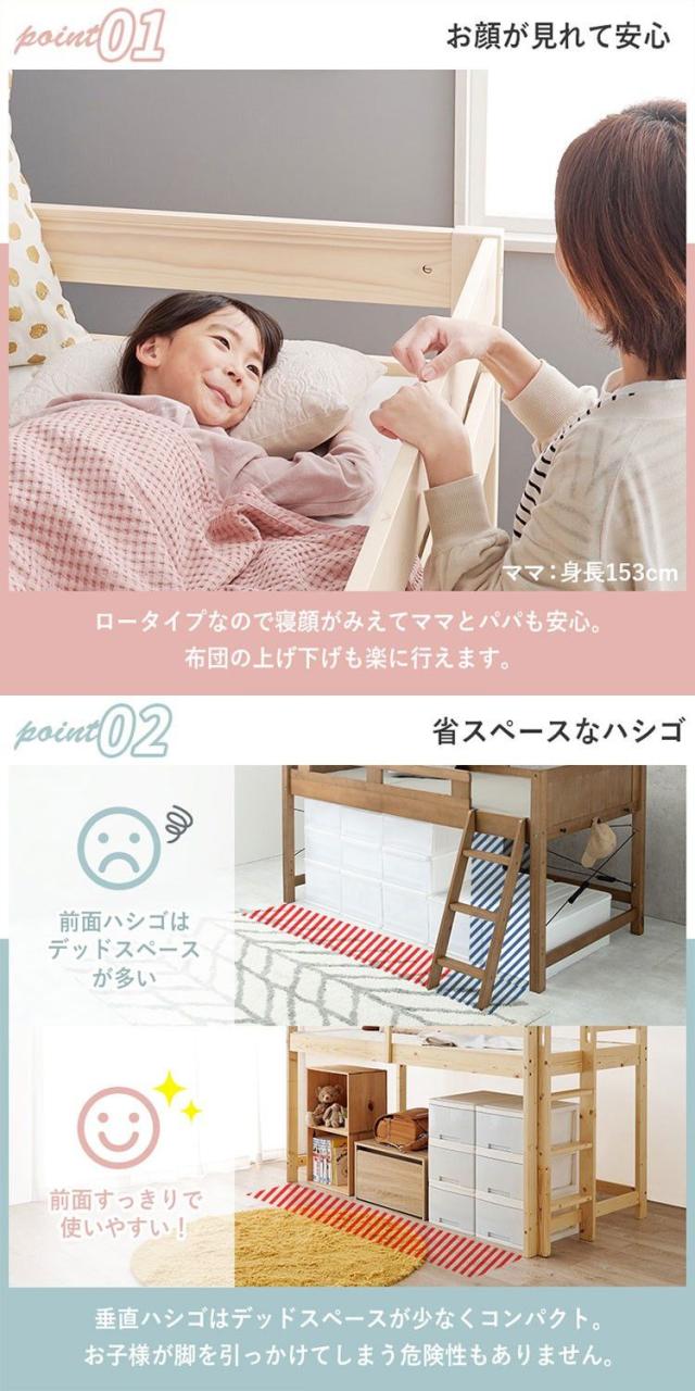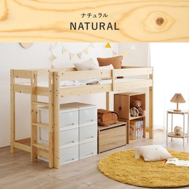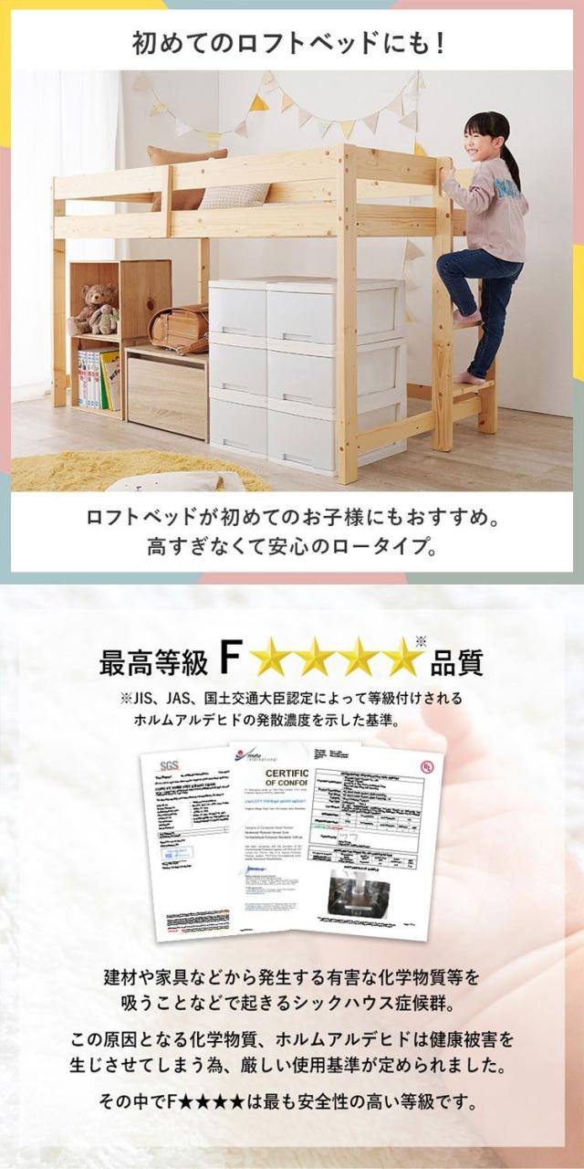 高さ120cmと低めなロフトベッド。床面下の収納も使いやすい省スペースな垂直のハシゴタイプです。薄型マットレス付。