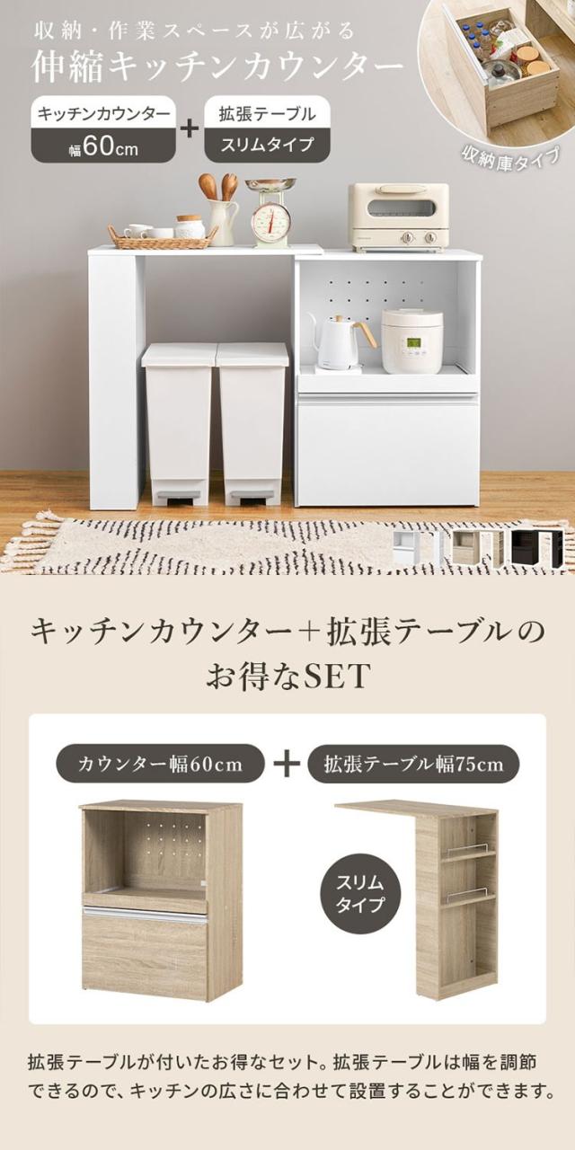 伸縮キッチンカウンター 2点セット 幅75~125 収納庫タイプ 2口コンセント 深型ドロワー スライド棚 キッチン収納 キャビネット 食器棚 レンジ台 レンジボード ごみ箱上ラック ゴミ箱上ラック おしゃれ(代引不可)【送料無料】