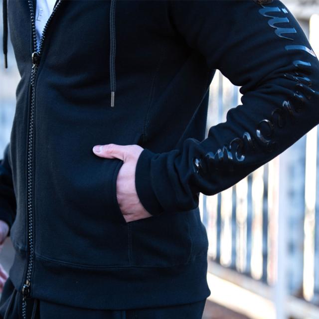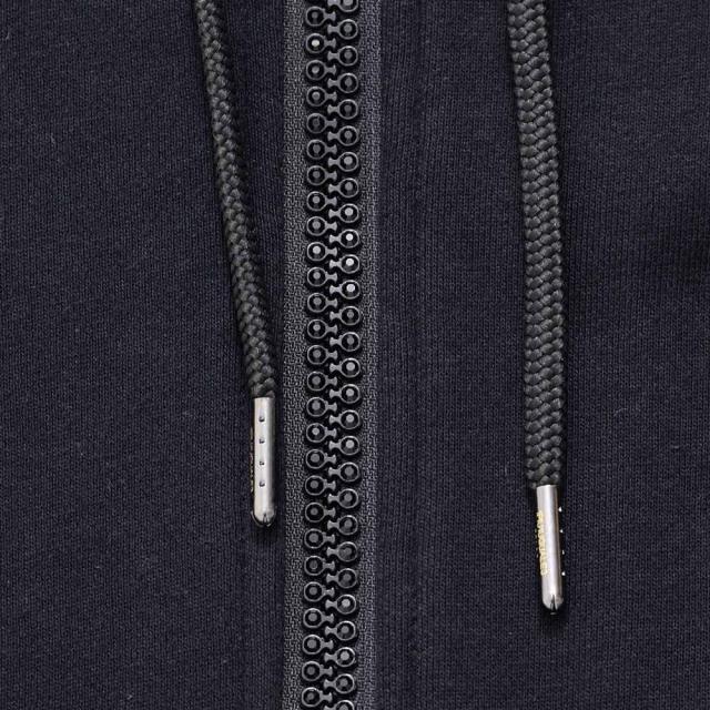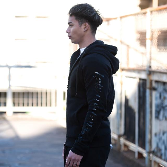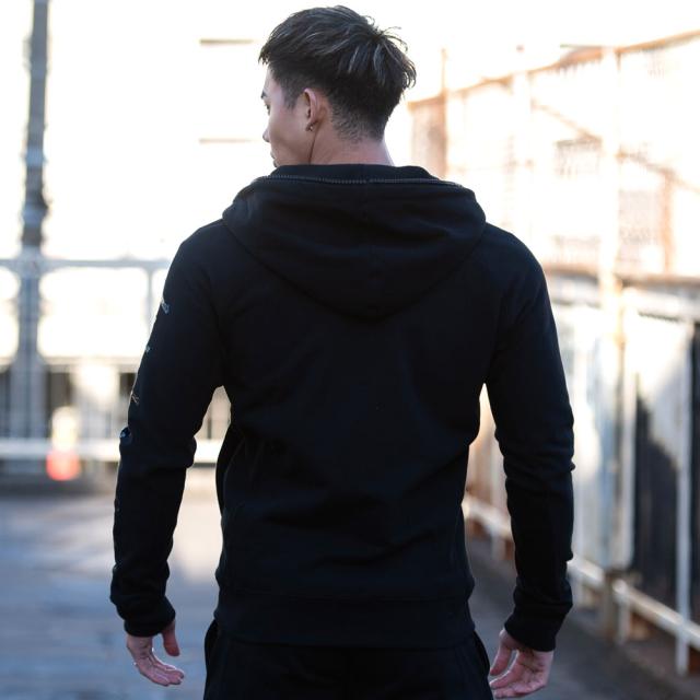 フロントからフードまでぐるりと囲んだファスナーにラインストーンを配置し、揺れる度にラグジュアリーな輝きが目を惹きます。