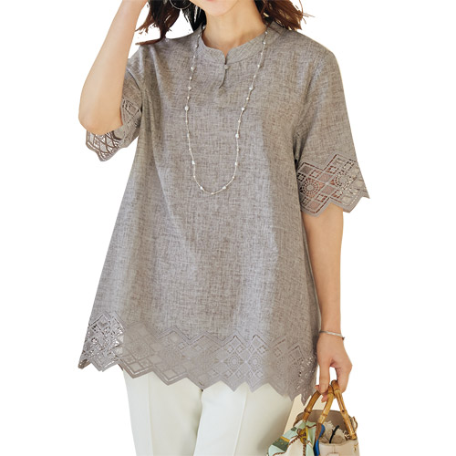 綿麻生地シャンブレーレース使いオーバーブラウス グレー ブラウス 半袖 マオカラー 裾レース レディース 婦人服 ミセス シニア 女性 フェミニン ナチュラル 上品 スタンドカラー チャイニーズカラー マンダリンカラー シンプル 無地 シニアファッション 40代 50代 60代 70代 80代 母の日 お母さん 春物 夏物 春夏