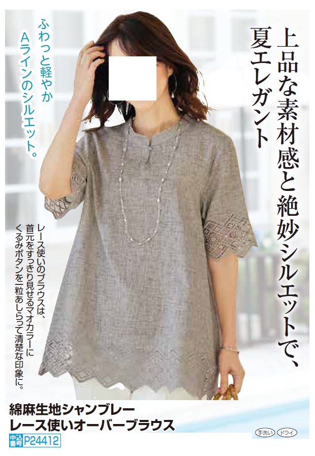 ブラウス 半袖 麻混 サマー レディース 綿麻生地シャンブレーレース使いオーバーブラウス グレー マオカラー 裾レース 婦人服 ミセス シニア 女性 フェミニン ナチュラル 上品 スタンドカラー 無地 ファッション 50代 60代 70代 80代 母の日 お母さん 春夏 nss p24412