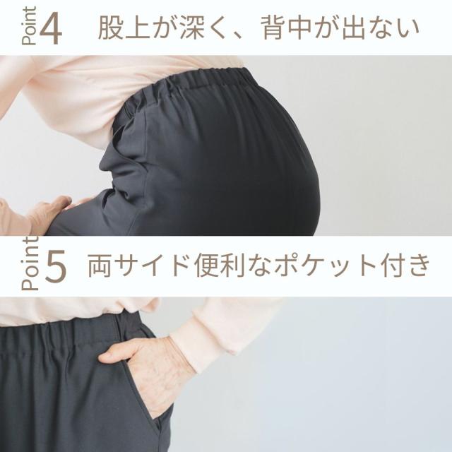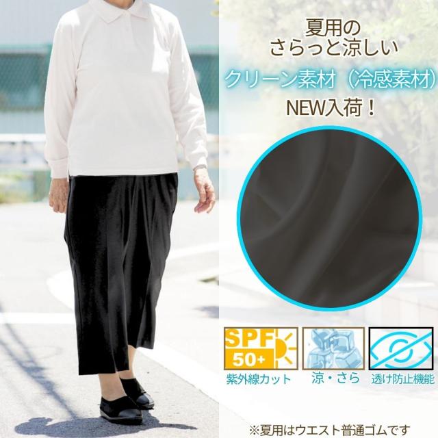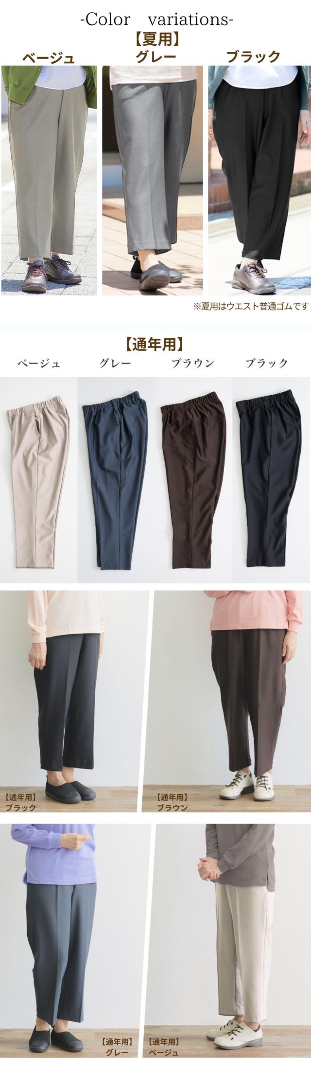 【カラー】 ブラック グレー ベージュ ブラウン【シーズン 】オールシーズン 通年着用可能 夏用着用可能【洗濯表示】 家庭洗濯OK【素材】 【通年用】ポリエステル:87%ポリウレタン:13% ストレッチ素材【夏用】ポリエステル:85% ポリウレタン:15%【商品説明文】シニアのミセスのために考えられた特許取得の特別なズボンです。かがんでも、背中の見えない安心デザインです。深い股上と長い後身頃!丈直しの手間もいらず、買ってすぐにご着用頂けます。(股下58-60CM)ポケットは前側に2つ物が落ちにくい深めに作られています。ポケットは前側に2つ、携帯電話もすっぽり入る深めに作られています。介護する人もされる人にも優しいスラックス。長く履いて頂いて頂けるようにゆったり作られています。締め付けの負担が軽減出来るようにウエストのゴムは調節出来ます。ご家庭で繰り返しお洗濯出来ますのでとっても経済的です。多くの方にご愛用頂けるようシンプルでスッキリしたデザインになっています。