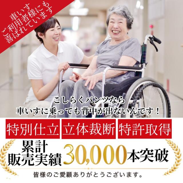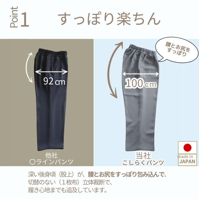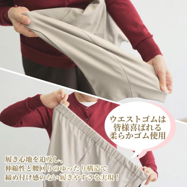 ■カラー ブラックグレーベージュブラウン■シーズン オールシーズン通年着用可能夏用着用可能■サイズ 【M】ウエスト:(64-70) ヒップ:95(87-95) 股上:27 股下:60 わたり:30.5 裾幅:18【L】ウエスト:(69-77) ヒップ:100(92-100) 股上:28 股下:60 わたり:32 裾幅:18.5【LL】ウエスト:(77-85) ヒップ:105(97-105) 股上:29 股下:60 わたり:33.5 裾幅:19【3L】ウエスト:(85-93) ヒップ:110(102-110) 股上:30 股下:60 わたり:35 裾幅:19.5※繊維製品のため、同じ商品であっても±1〜2cmの差が生じる場合がございます。■洗濯表示 家庭洗濯OK素材(生地・毛糸) 【通年用】ポリエステル:87%ポリウレタン:13% ストレッチ素材■【夏用】ポリエステル:85% ポリウレタン:15%■商品説明文 シニアのミセスのために考えられた特許取得の特別なズボンです。かがんでも、背中の見えない安心デザインです。深い股上と長い後身頃!丈直しの手間もいらず、買ってすぐにご着用頂けます。(股下58-60CM)ポケットは前側に2つ物が落ちにくい深めに作られています。ポケットは前側に2つ、携帯電話もすっぽり入る深めに作られています。介護する人もされる人にも優しいスラックス。長く履いて頂いて頂けるようにゆったり作られています。締め付けの負担が軽減出来るようにウエストのゴムは調節出来ます。ご家庭で繰り返しお洗濯出来ますのでとっても経済的です。多くの方にご愛用頂けるようシンプルでスッキリしたデザインになっています。シニアのご婦人に合せた丈直し不要の丈の長さになっています(股下58-60CM)お買い上げ頂いてすぐにご着用頂けます。【1003782】※車いすをご使用の場合股下(60cm以下)が短すぎるとスソが上がり過ぎて脚の冷えにつながりますので適度な長さの股下商品をお選び頂くことをおススメしています。落ち着いたカラーで合わせやすくなっています。ご注意事項 モニターの発色の具合によって実際のものと色が異なる場合がございます。 生地の性質上、寸法に多少の誤差がございます。予めご了承ください。プロスポーツチームが運営している専門病院で地域の方や高齢者向けにスポーツ選手へのケアを民間に提供する医療施設が作られ始めました。野球、サッカー、柔道、体操など運営するチーム、企業がスポーツドクター、トレーナー、整体師などの専門知識を民間の高齢者や地域の子供向けにおこなっています。ご自分でお着かえ出来る方にも脱ぎ着が圧倒的にラクです。介護を必要とされるご自身でお着替え出来ない方は介護士の方の支援になります。この時に履かせる側の介護士様からストレッチでゆったりしたズボンを要望されました。はかせる側の方にもはく方にもラクでストレスが少ないそれがこしらくパンツです。夏の毎日をもっと快適に。汗ばむ季節でもさらっと涼しく過ごせる、シニア世代のための「涼感パンツ」が新入荷しました。生地には、触れた瞬間にひんやりと心地よい冷感素材「クリーン素材」を使用。通気性にも優れており、風が通り抜けるような軽やかさで、暑い季節の外出や家事、散歩の時間も快適に過ごしていただけます。また、紫外線をしっかりカットするSPF50+のUVカット機能付きで、屋外での活動も安心。年齢を重ねると気になりやすい紫外線対策も、これ一枚でOKです。さらに、透け防止機能付きなので、明るい場所や日差しの強い場所でも安心して着用できます。透け感を気にせず、普段使いから施設内の活動まで幅広くご活用いただけます。家庭で洗濯できるので、お手入れも簡単。乾きも早く、汗をかく季節でも清潔に保てます。このパンツは、家事や買い物などの外出着としてはもちろん、介護施設での制服代わりにもぴったり。通気性と快適性、そして安心感を兼ね備えた、夏の定番パンツです。サイズ感はゆったりめで、同じLサイズでも他社商品と比べて余裕があり、動きやすさが違います。体型を選ばず、リラックスして着用いただける一本です。■関連キーワード シニア ファション 高齢者パンツ レディース 高齢者ズボン こしらくパンツ シニア ズボン 【特許】背中が見えない後が長い下着が出ない縫い目なしゴワゴワしない履きやすい着ごこちいい【日本製】ストレッチ全方向ストレッチシニア服おばあちゃんプレゼント敬老の日母の日ギフトシニアファッション前かがみ背中の下着が見えない【3L】大きいサイズゆったりシニア人気カラー洗濯機OK丈直しせずすぐに履けるすぐはける特許デザイン背中が見えない下着がでない継ぎ目なし継ぎ目ないから縫い目がごろごろしない着ごこちいいはき心地いい継ぎ目がないからはいた時に引っ掛かりなし【80代】米寿ギフトプレゼント敬老の日30000本販売【ベージュ】【グレー】【ブラウン】ウエストゴムゴム取り出しサイズ直しサイズ調節できるサイズ調節可能股上深め股上深い特許こしらくパンツ後が長い