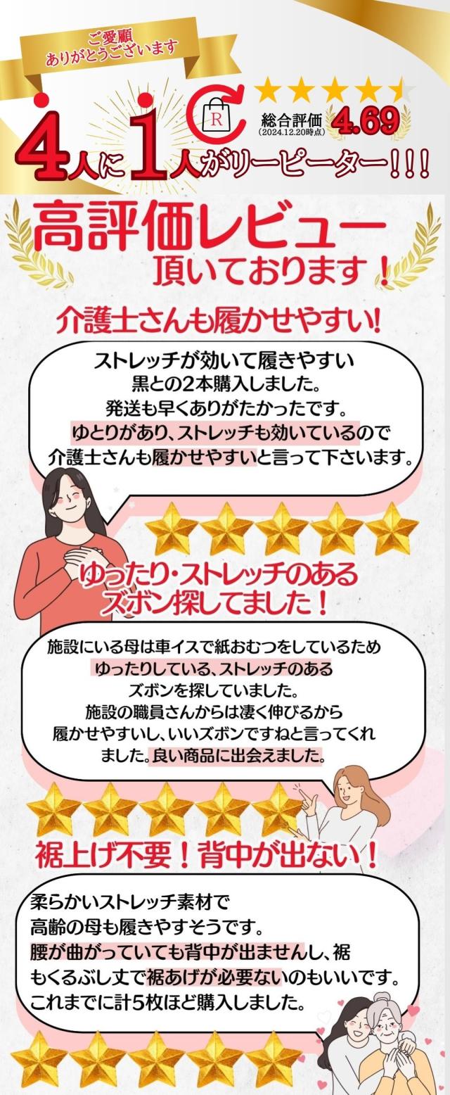 - 車イス生活で紙オムツをしている母に、ぴったりのパンツを探していました。柔らかくて肌触りが良く、よく伸びるので、とても履き心地がいいみたいです。