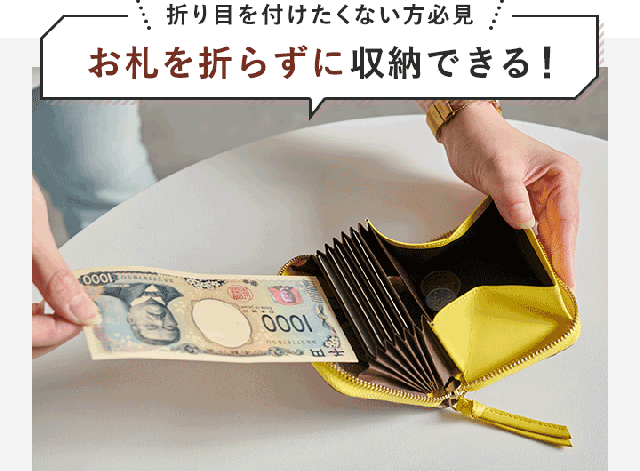 お札は折り曲げずに収納可能。二つ折りで収納しても