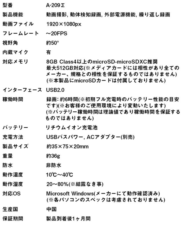 ■A-209Σ フルHD キーレス型カメラ 【小型カメラ】【オンスクエア】【スパイダーズX】