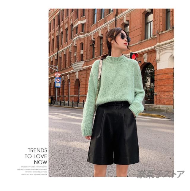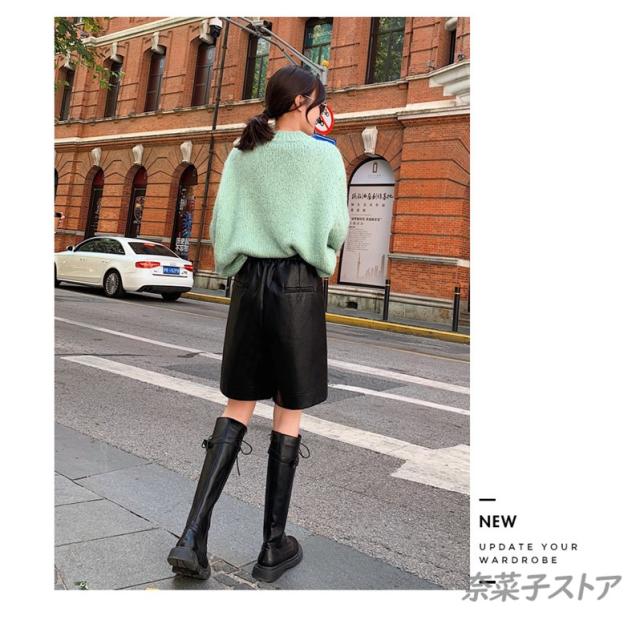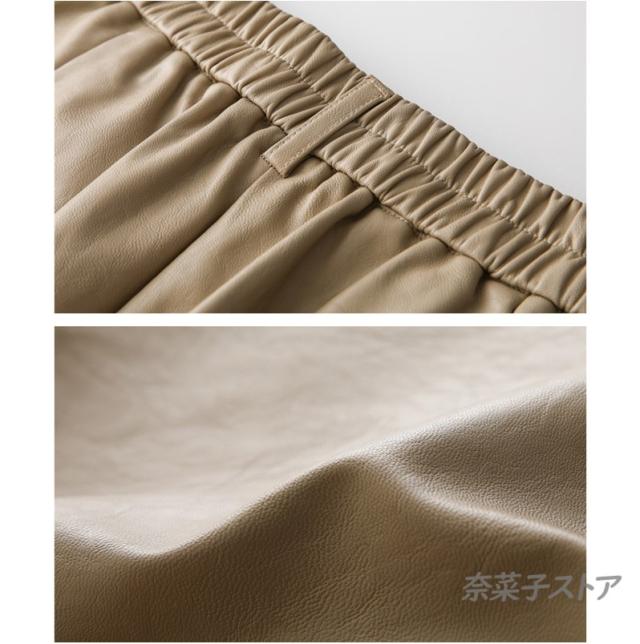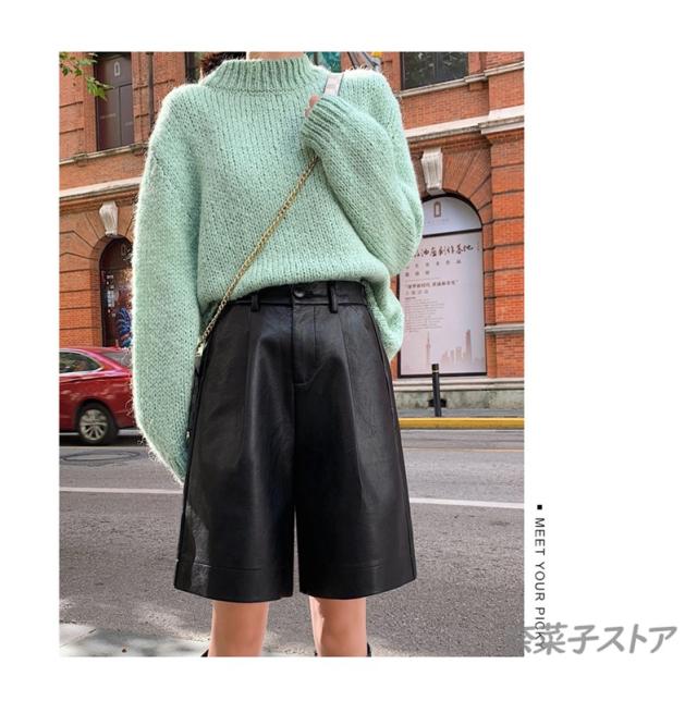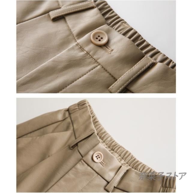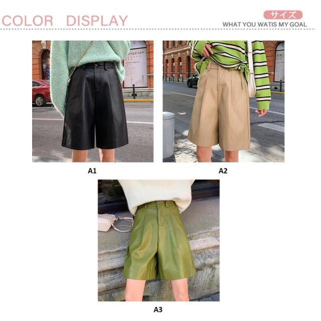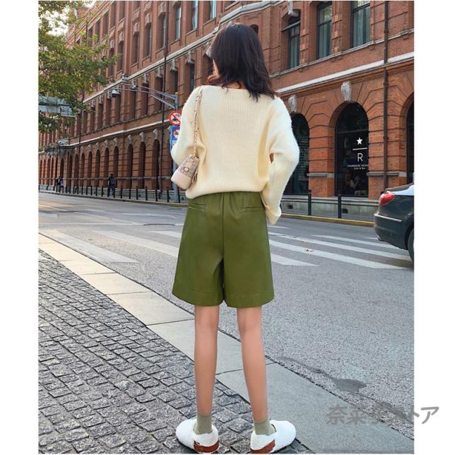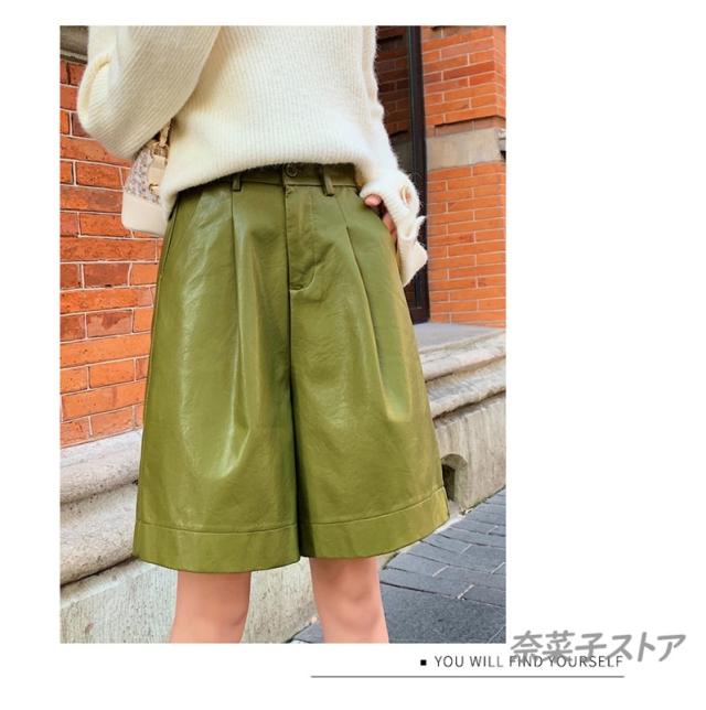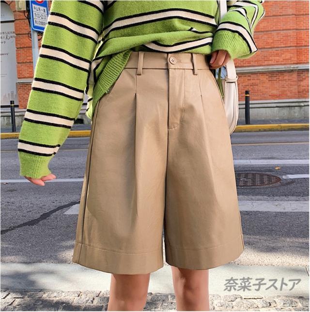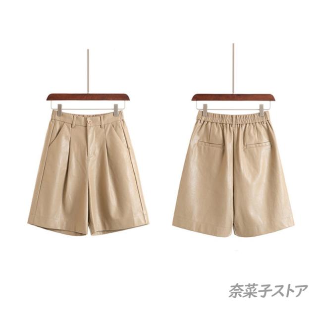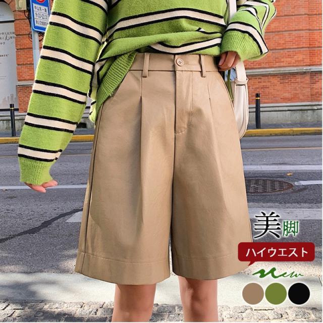 レザーパンツ レディース ハーフパンツ ワイドパンツ ウエストゴム 革パンツ 膝丈 5分丈 ハイウエスト Aライン レザー 美脚 大きいサイズ