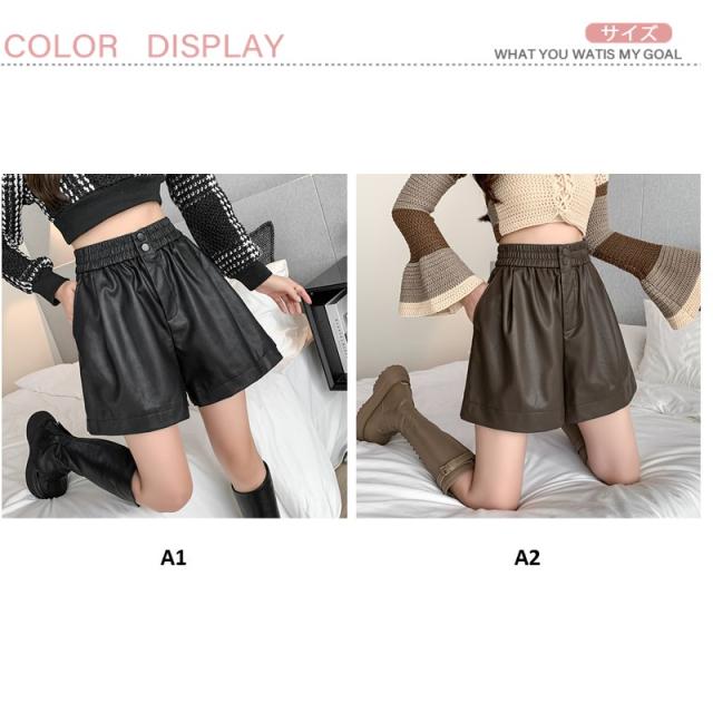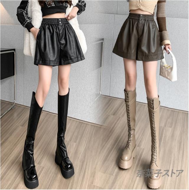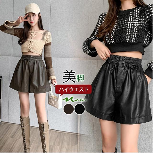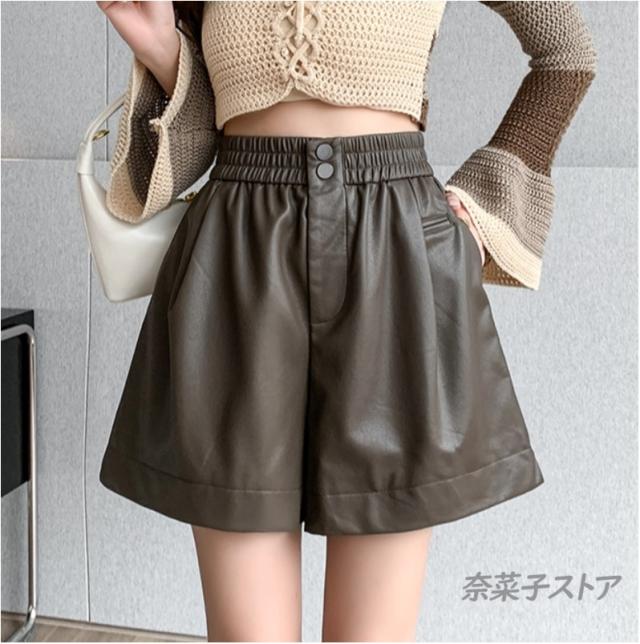 レザーパンツ レディース ゆったりハーフパンツ ワイドパンツ ウエストゴム 革パンツ ショート丈 ハイウエスト Aライン レザー 美脚