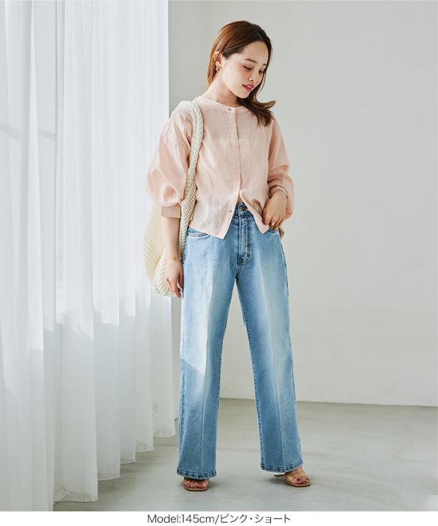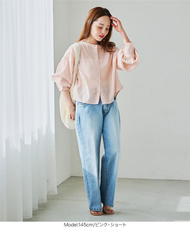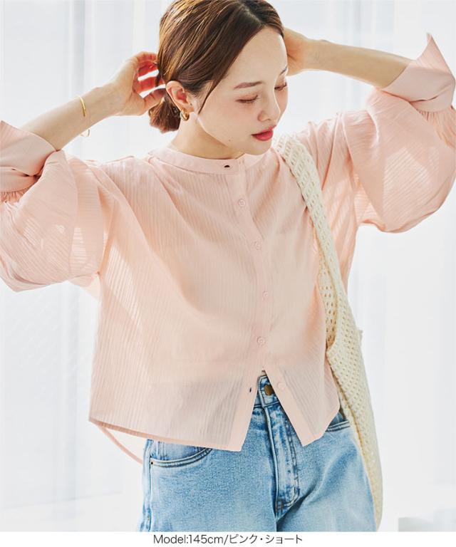春新作 [ 田中亜希子さんコラボ ] 選べる2丈ボリュームスリーブシアーシャツ C6967 入荷済 レディース 20代 30代 40代 バンドカラー シアシャツ 透け ブラウス ショート ロング クロップド チュニック
