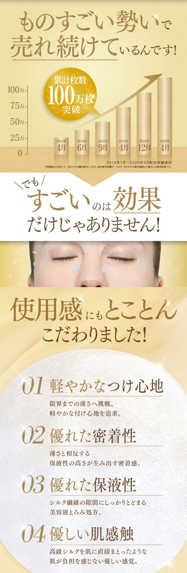 優しく肌を覆い、美のうるおいつづくシルク配合のフェイスマスク(シート状マスク)です。