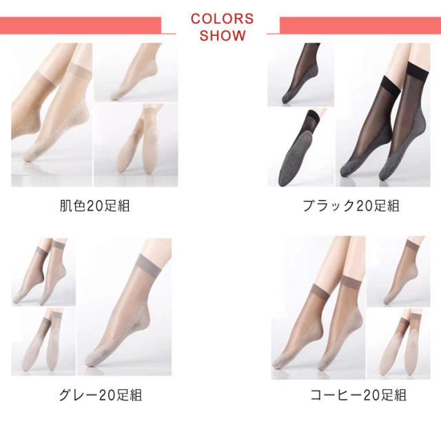 | 透明感が涼しげなシースルーソックス20足セットです! 透け感があり、見た目にも涼しさを感じるシアー素材。 パンプスやスニーカー、サンダルにあわせれば足元からおとなかわいく素敵に女性らしさアップ! つま先・かかと部分はいつもの靴下と同じ生地感で爪やかかとをしっかりカバー! | |