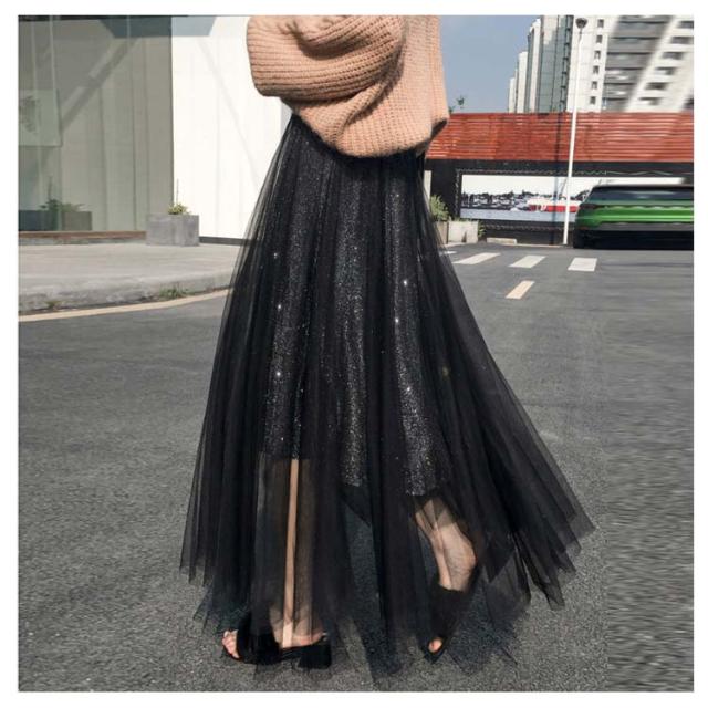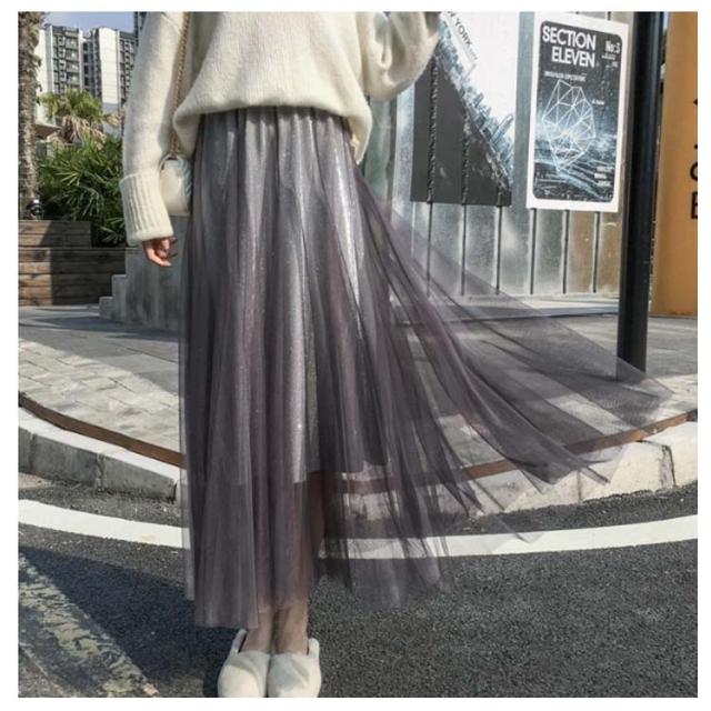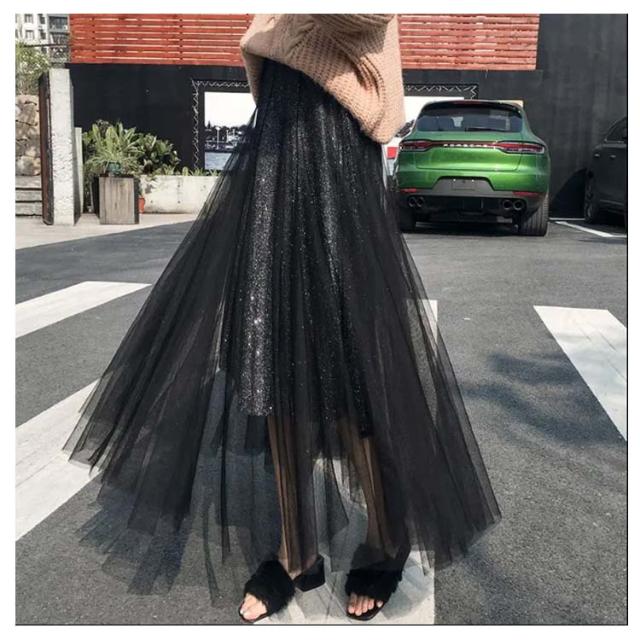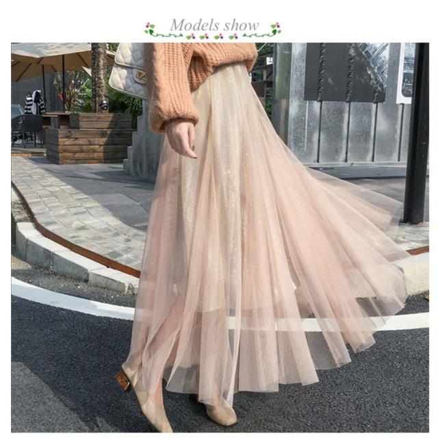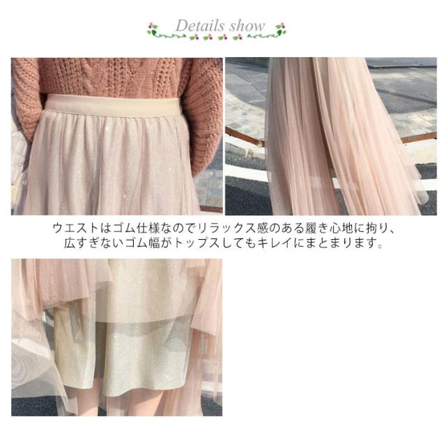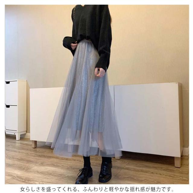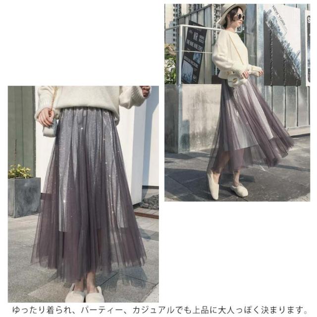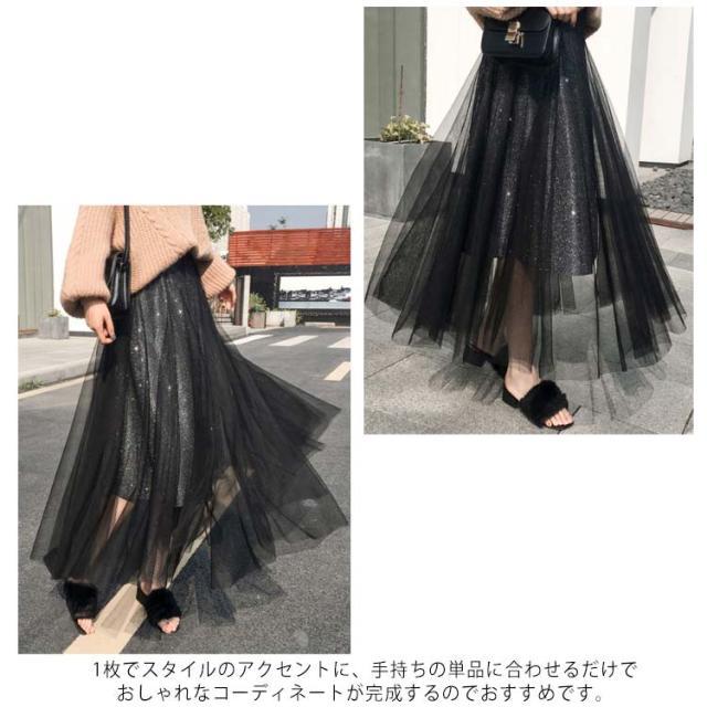キラキラ スカート チュールスカート ロングスカート フレアスカート ウエストゴム 大人 可愛い シースルー ラメ入り 結婚式 パーティー お呼ばれ 美脚 20代 30代 40代 50代 ダンス衣装 全5色 送料無料