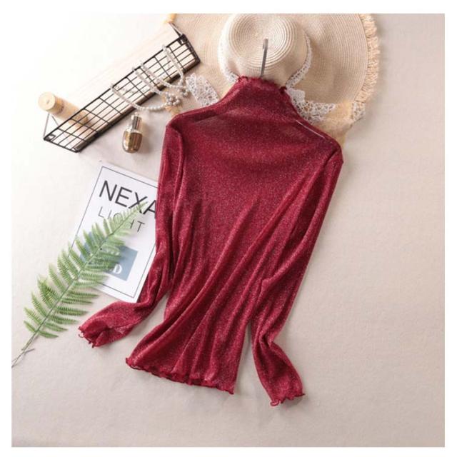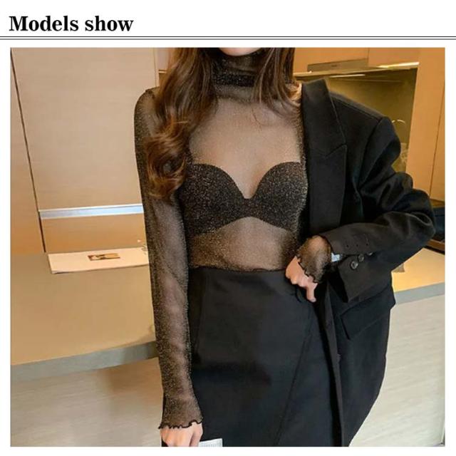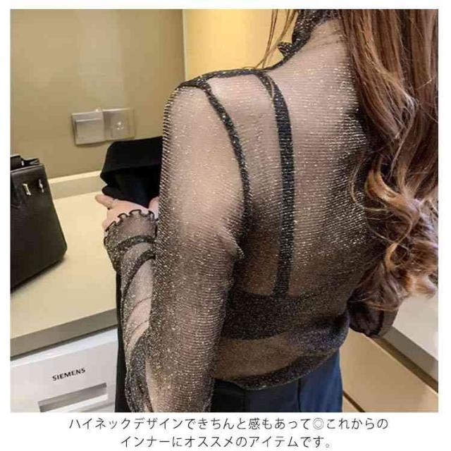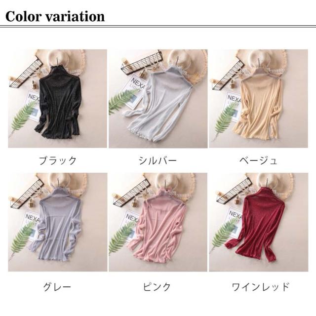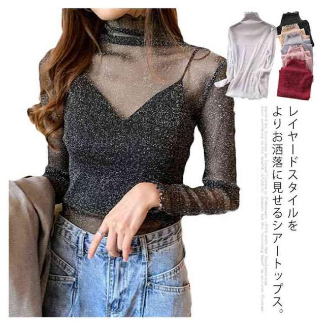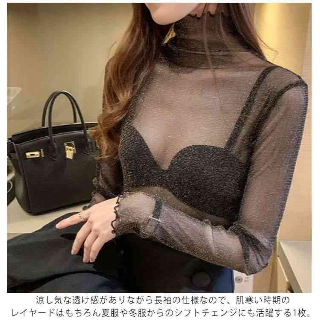 【送料無料】シアートップス シースルー レディース 長袖 ハイネック メロウ インナー 透け感 レイヤード コーデ 重ね着 薄手 きれいめ かわいい セクシー 韓国 ベージュ ブラック ホワイト シルバー 人気 トレンド 無地 ストレッチ S-4L