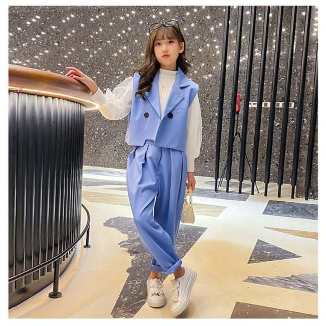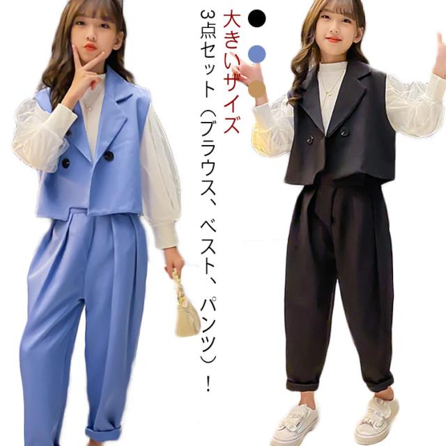 卒業式 スーツ パンツスーツ 女の子 フォーマルスーツ 3点セット ベスト ブラウス 長袖 パンツ 子供服 子供スーツ 小学生 卒服 ゆったり 大きいザイズ カジュアル 無地 おしゃれ 春 秋 入学 卒業 卒園 入園 発表会 七五三 結婚式 記念 お受験 送料無料
