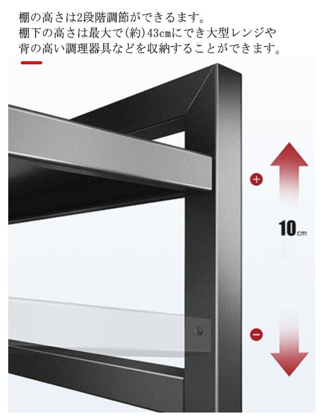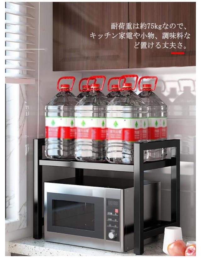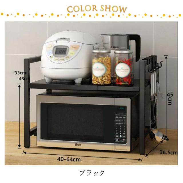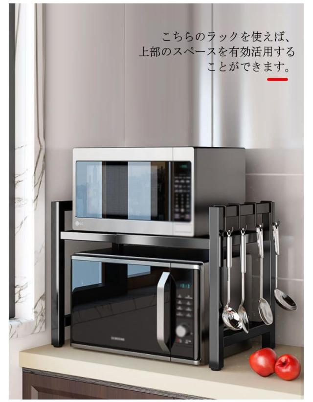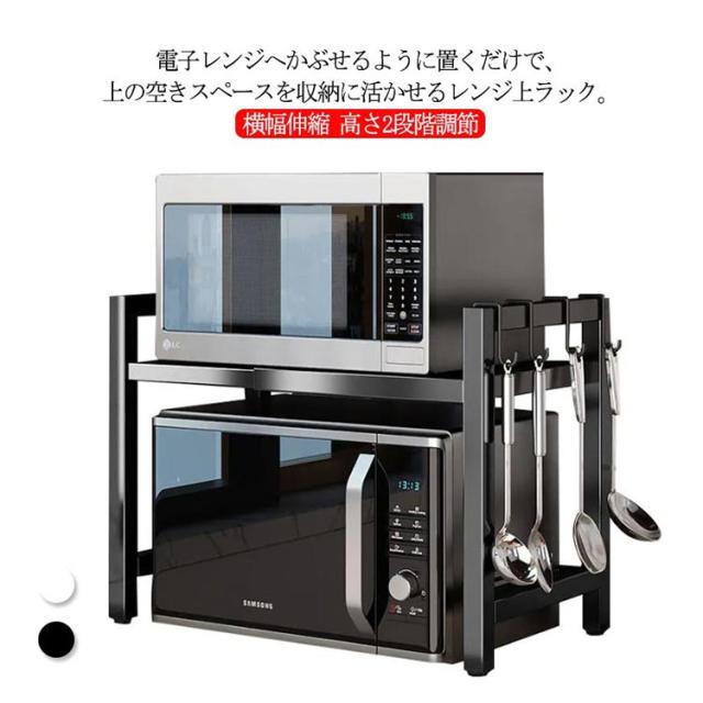 | 電子レンジへかぶせるように置くだけで、上の空きスペースを収納に活かせるレンジ上ラック。横幅伸縮 高さ2段階調節 こちらのラックを使えば、上部のスペースを有効活用することができます。 耐荷重は約75kgなので、キッチン家電や小物、調味料など置ける丈夫さ。 幅は約40〜64cmの間で伸縮でき、レンジの大きさやスペースに合わせて幅を調節できます。 棚の高さは2段階調節ができるます。棚下の高さは最大で(約)43cmにでき大型レンジや背の高い調理器具などを収納することができます。 フレームはスチール製で安定感があります。 サイドにフックが付いて、お玉などのキッチンツールなどを掛けるのに便利 シンプルなデザインだから圧迫感がありません。 | |