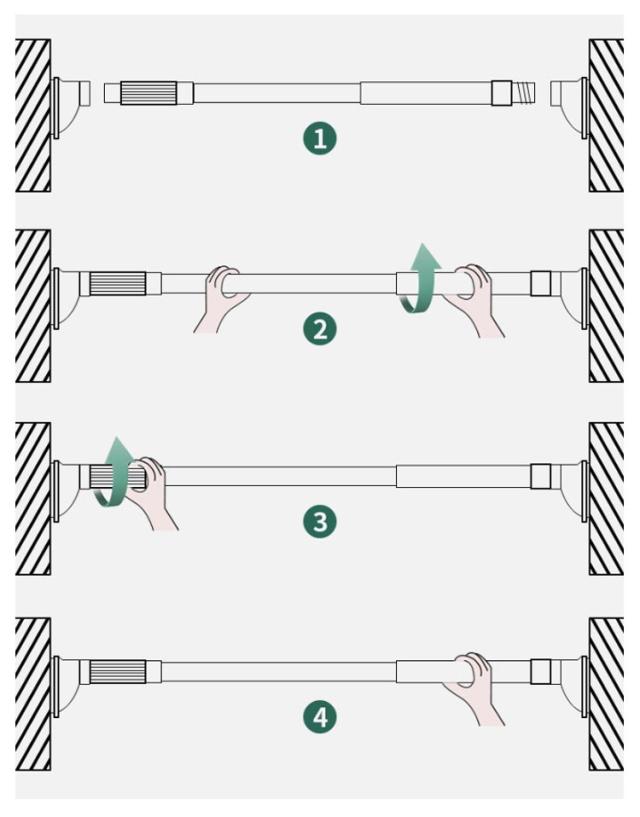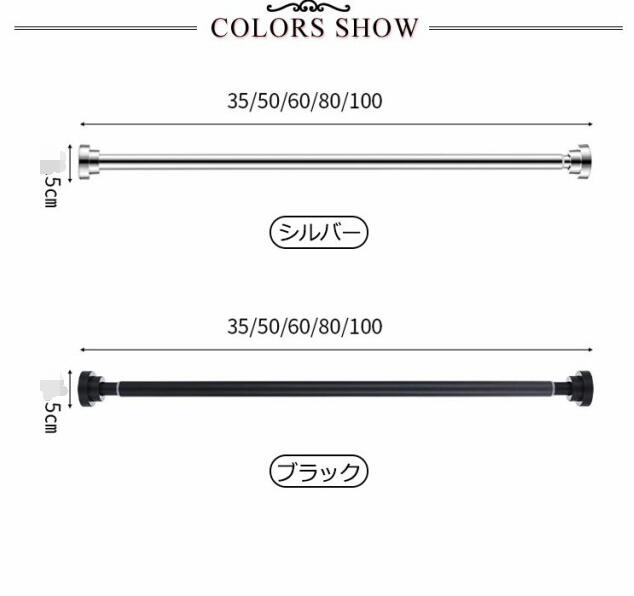 | サイズについての説明 | 35cm (伸縮40-55cm) 50cm (伸縮55-85cm) 60cm (伸縮65-100cm) 80cm (伸縮85-130cm) 100cm (伸縮105-160cm) ※サイズ表の実寸法は商品によって1-3cm程度の誤差がある場合がございます。 【取り付け方法】 1.突っ張り棒を伸ばし、両サイドをしっかり壁に当てます 2.突っ張り棒が水平になるよう調節します 3.両手で太い棒の方を回し壁にしっかり固定させたら完成です |