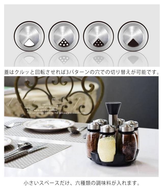 | 360度回転!キッチン周りをワンランクアップしてくれる調味料セット 小さいスペースだけ、六種類の調味料が入れます。 土台は回転式なので便利です。デザイン性も高く家庭用・業務用にオススメです。 瓶下はガラスになっているので中に入れた調味料もすぐに確認しやすいです。 蓋はクルッと回転させれば3パターンの穴での切り替えが可能です。 質の高いガラス・ステンレス製。お手入れ簡単にもうれしい♪ 調味料をまとめて収納し、統一感のあるすっきりとしたキッチンを目指してみてはいかがでしょうか。 | |