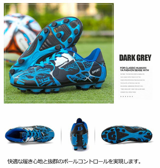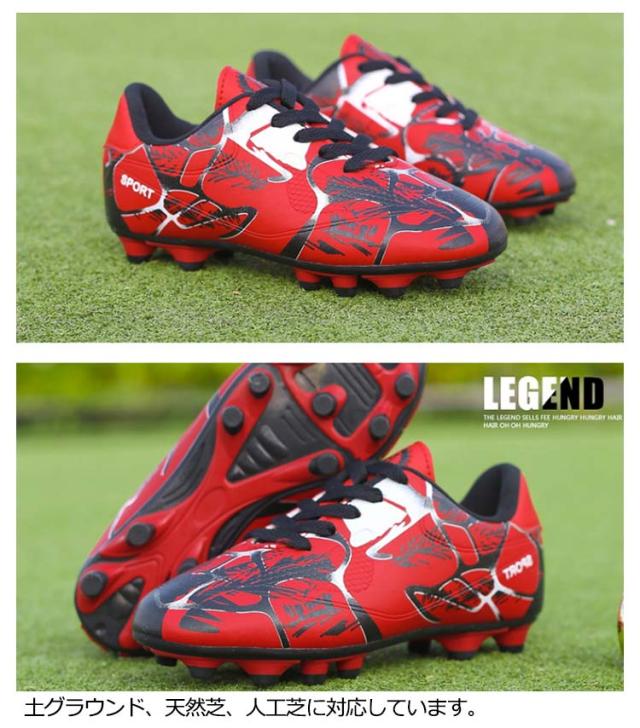 | サッカーのトレーニングや試合などで履くサッカーシューズ。 靴底にはスタッドが付いて、グリップ力が強くて、滑りにくく丈夫なので、スポーツシューズとしては最適。 全体的に足にフィットするように作られており、適度なクッション性もあります。 上品なPUを使用し、柔らかい素材感と耐久性があり、機能性を保証できます。 快適な履き心地と抜群のボールコントロールを実現します。 男女に問わず、ジュニアの通学用など利用する方におすすめ。 土グラウンド、天然芝、人工芝に対応しています。 | |
