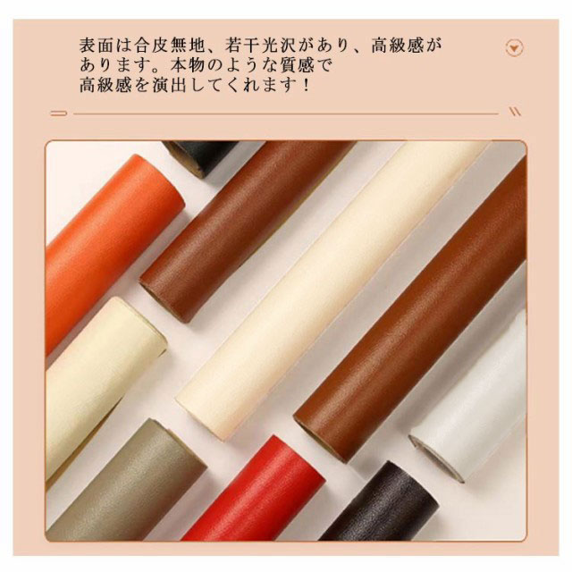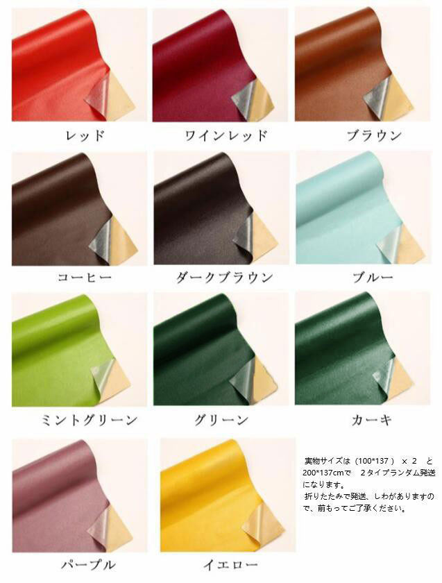 | 全20色!使いやすい貼るタイプPVCレザー。【200×137cm】【厚さ0.8mm】 この補修シートなら合皮レザーの裏が接着シールなので剥離紙をはがして貼るだけ簡単に補修ができます接着剤の粘着力が優れていて誰にでも使いやすい商品簡単に買い替えができないソファなどの破れ、傷などの補修に最適! 表面は合皮無地、若干光沢があり、高級感があります。本物のような質感で高級感を演出してくれます! ご自宅にはハサミで簡単に作業が可能、扱いやすさも大きな魅力の便利レザーシートです。 豊富なカラーバエーション気軽に、インテリアのイメージチェンジも楽しめます!自分好みのインテリアが実現! 【用途】:補修シールとして自転車のサドル・車のシート・バイクのシート・ソファーのシートなどの張り替え、修理、修補、破れ隠し、椅子の座面張替。内装、レイアウト、壁紙、インテリア、撮影用スクリーン、小物づくり、DIYなどにも使用でき、色々な用途にご利用いただくことができます。化粧箱、ギフトケースなどに貼るにも最適です。 補修シールとして使い方について:※ 補修の貼りは簡単で素人でも完璧に仕上がります。Step1:補修及び改装を必要とする個所を確認します。Step2:必要とする個所を綺麗に拭き取って乾かしてください。Step3:必要のサイズを切り取ってください。Step4:剥離紙をゆっくりはがしながら貼りたい部分に密着させていただき、生地の表面が盛り上がったり隙間ができることのないように貼り付けてください。★貼り付けてから、できるだけ24時間そのまま放置してください、24時間後はしっかり接着しております。貼り換えを行った後は見違えるようになります。 | |