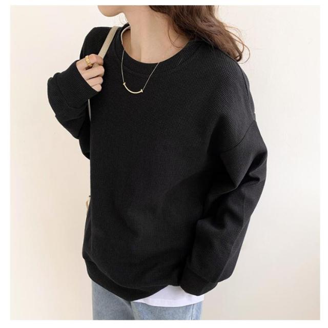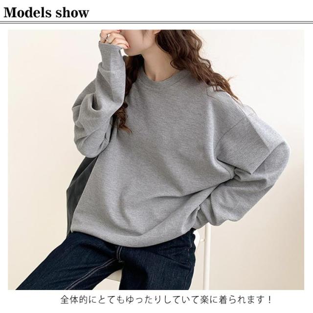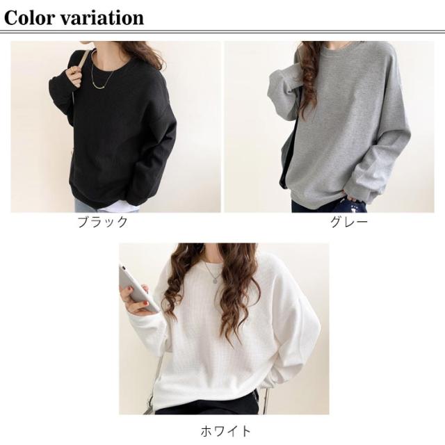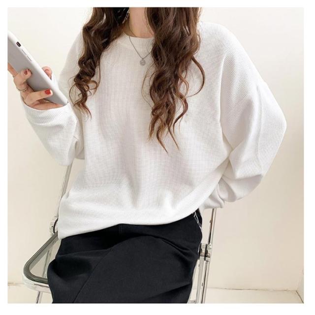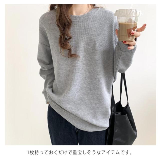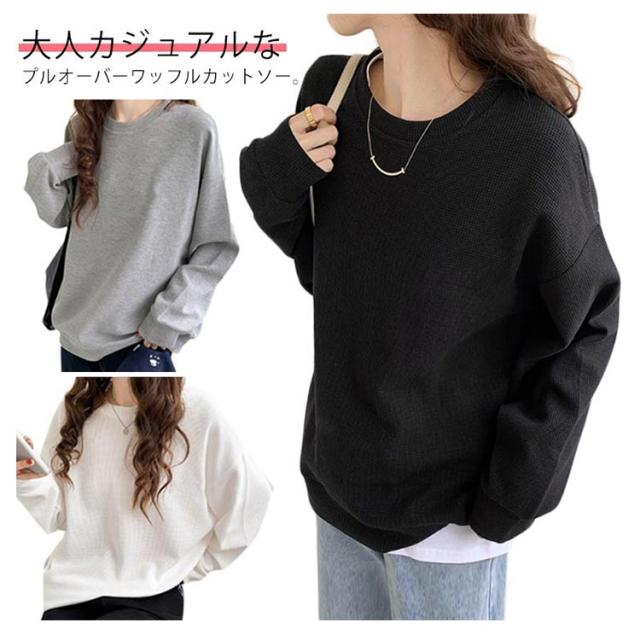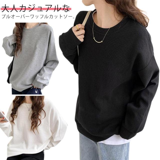【送料無料】 Tシャツ カットソー レディース トップス 長袖 ワッフル ゆったり 春 秋 ワッフルカットソー ラウンドネック プルオーバー ワッフルトレーナー 黒 白 ブラック グレー ホワイト
