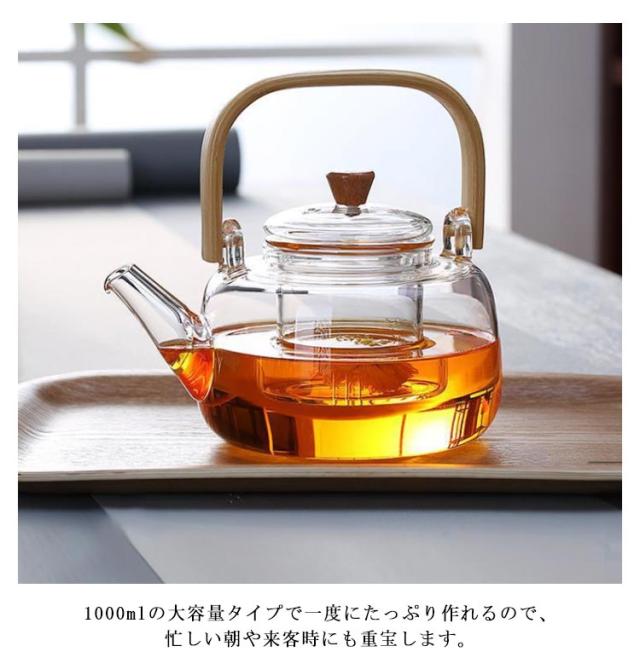 | 直火可能な耐熱ガラスケトル。 耐熱ガラスでできているため、お湯から冷たいお茶までまで入れられるうえ、直火にもかけられます。 竹素材のハンドルはしっかりと握ることができ、液だれしにくい注ぎ口の形も魅力。 ポットに茶こしがついており、カップに注ぐときに茶葉をキャッチするので便利です。 1000mlの大容量タイプで一度にたっぷり作れるので、忙しい朝や来客時にも重宝します。 | |