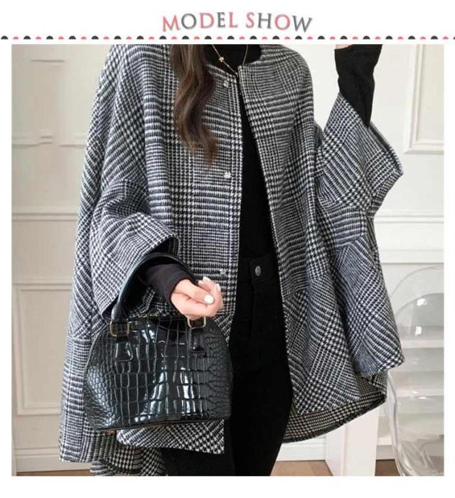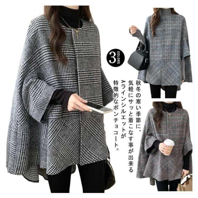 ポンチョコート ウール調 コート マント レディース 冬 アウター ドルマン ケープ 冬コート Aライン ケープ風 ケープコート ジャケット 秋冬 チェック柄 あったか 暖かい 防寒 体型カバー シンプル カジュアル きれいめ OL 通勤 送料無料