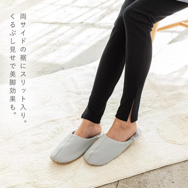 両サイドの裾にスリット入りでスッキリとしたラインに。くるぶし見せで美脚効果も。