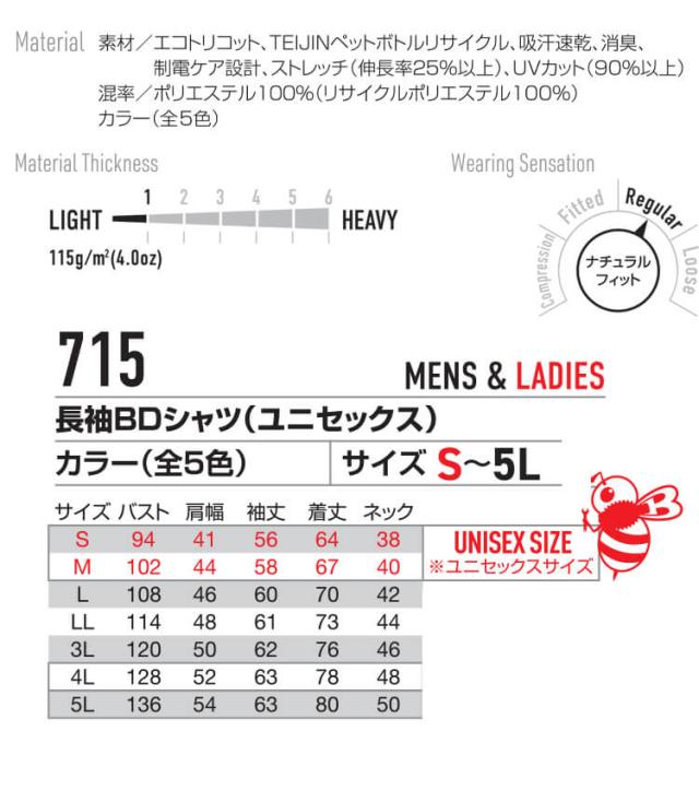 BURTLE バートル 長袖ポロシャツ 715 サイズS〜3L 男女兼用