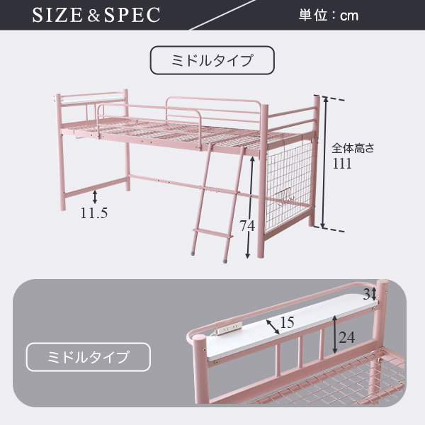 ●空間を有効活用できるロフトベッドでハイタイプ・ミドルタイプに高さ調整可能です!