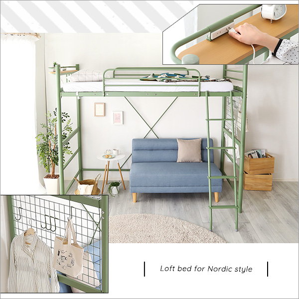 ロフトベッド 階段付き ミドル ハイタイプ 2way 北欧インテリア Levata スチールパイプ 宮棚 コンセント付き