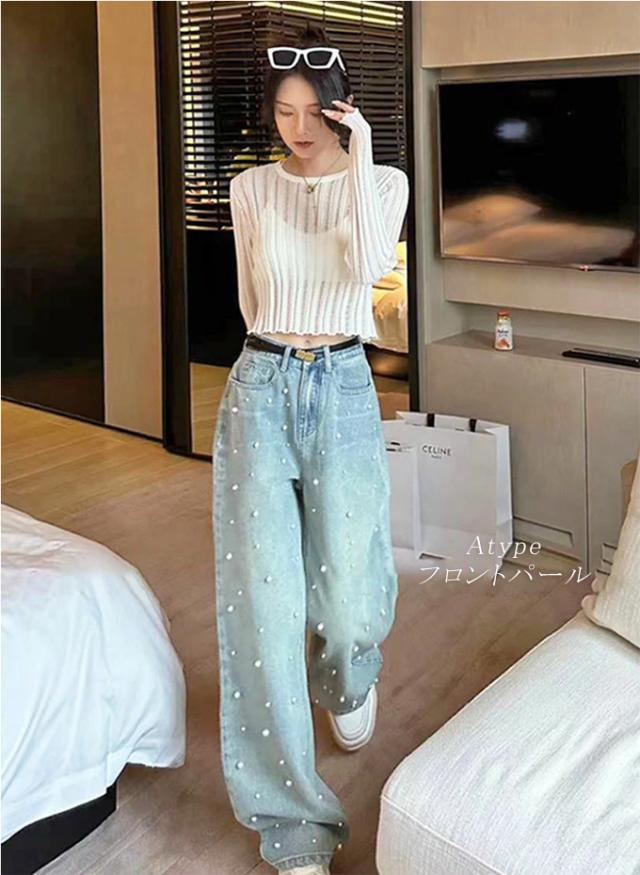艶めくパールを散りばめたハイウエストデニムパンツ