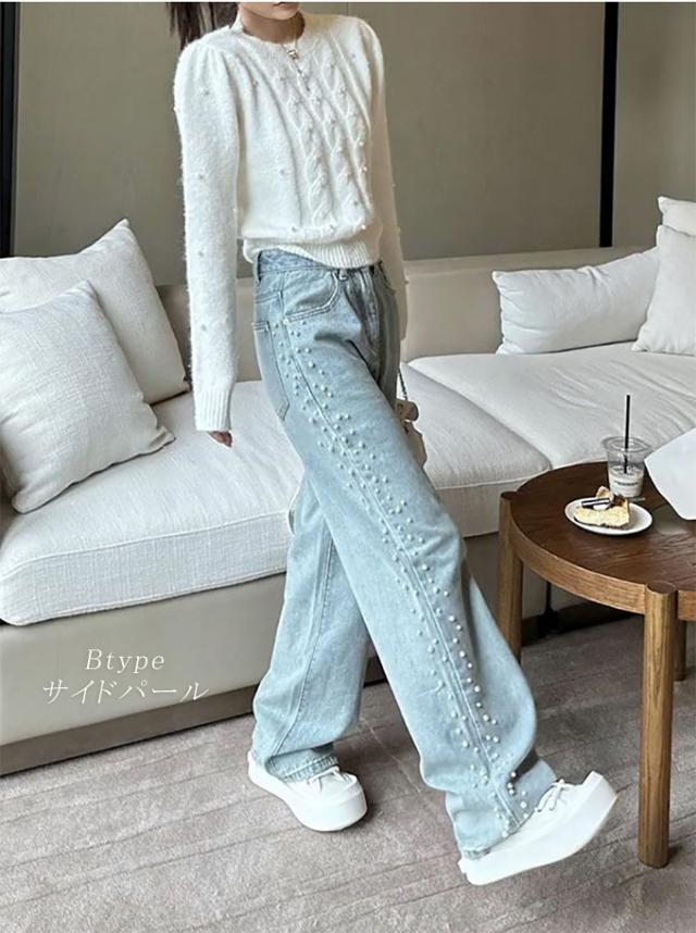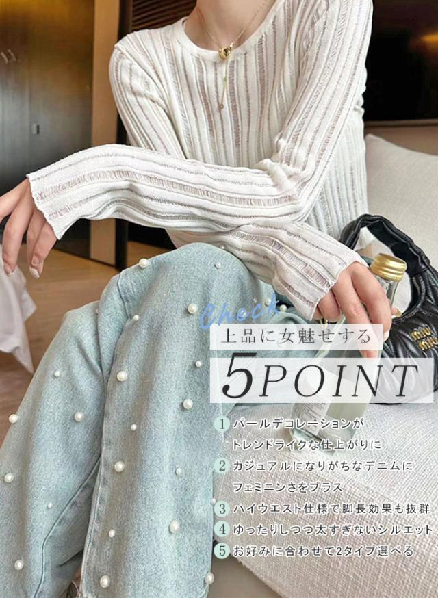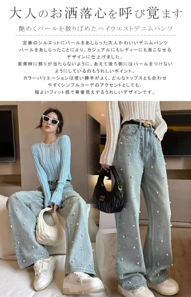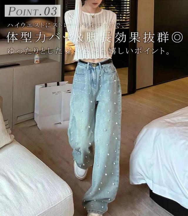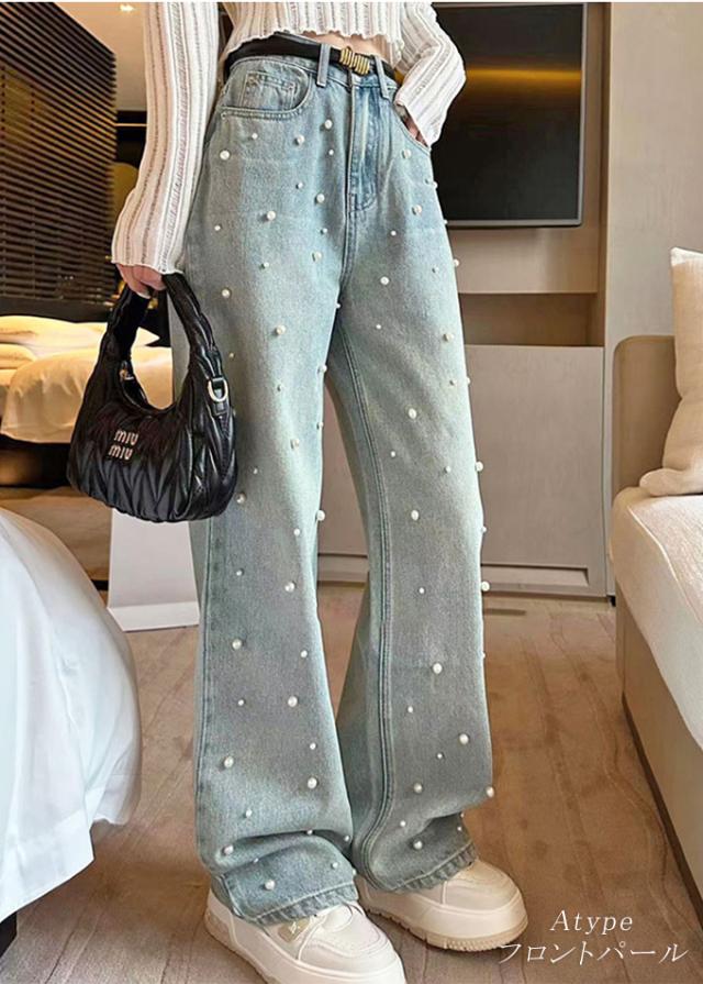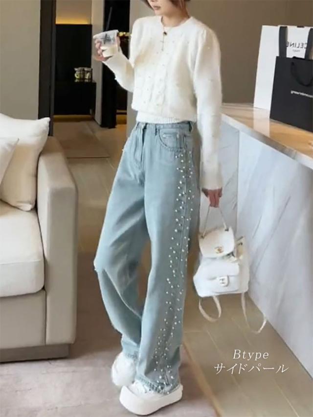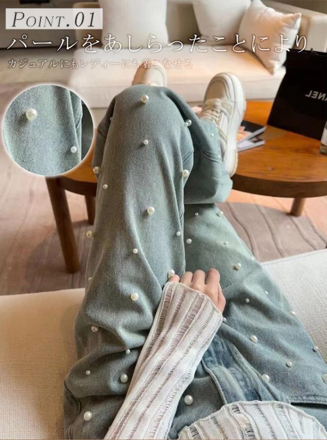 定番のシルエットにパールをあしらった大人かわいいデニムパンツ
