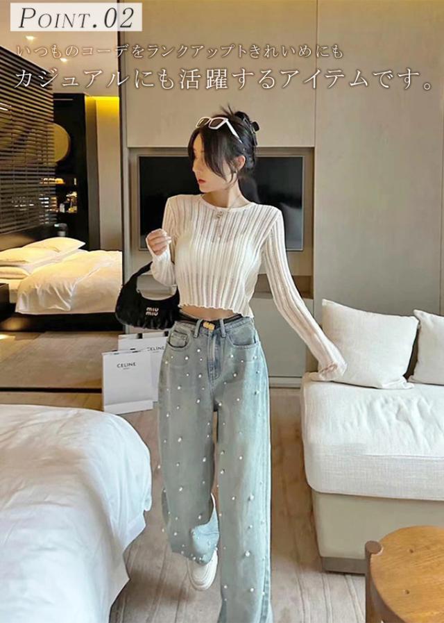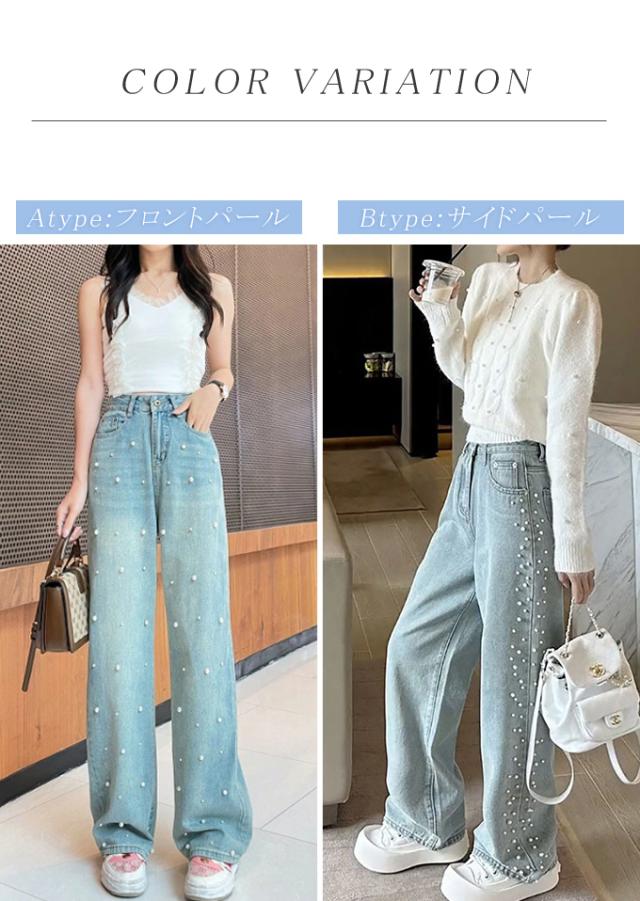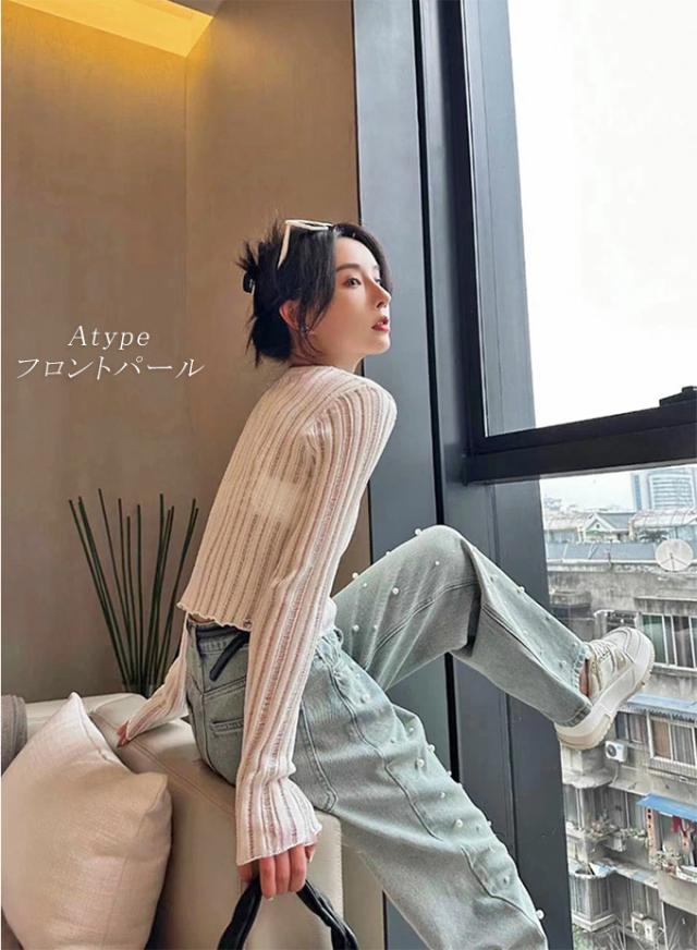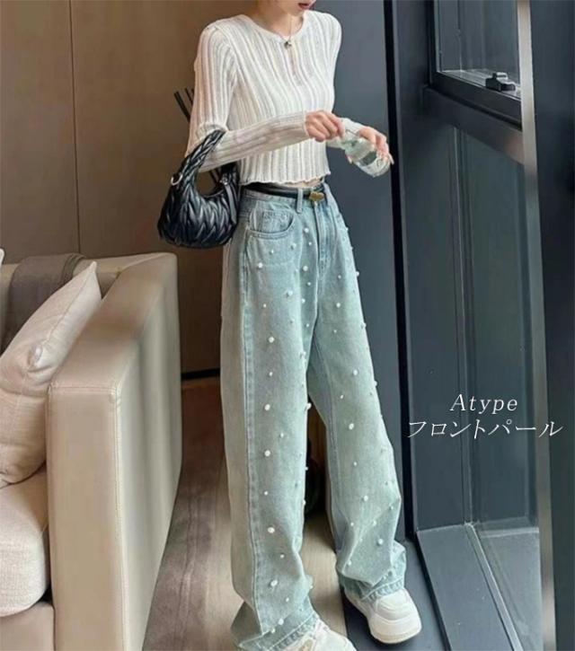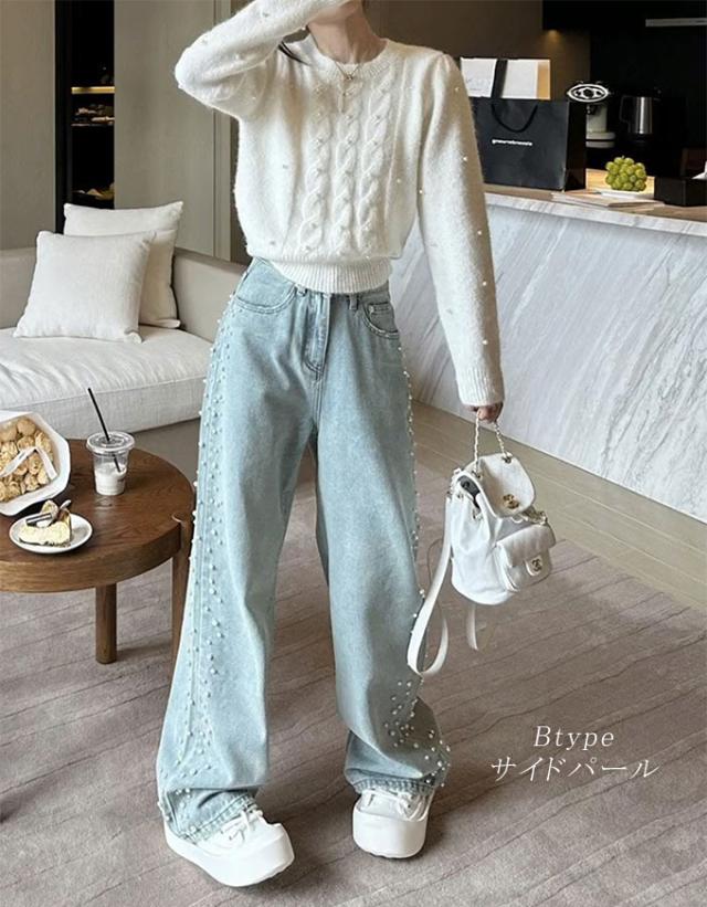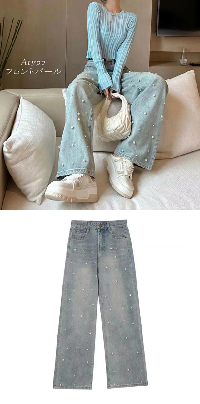 定番のシルエットにパールをあしらった大人かわいいデニムパンツ