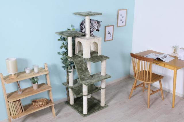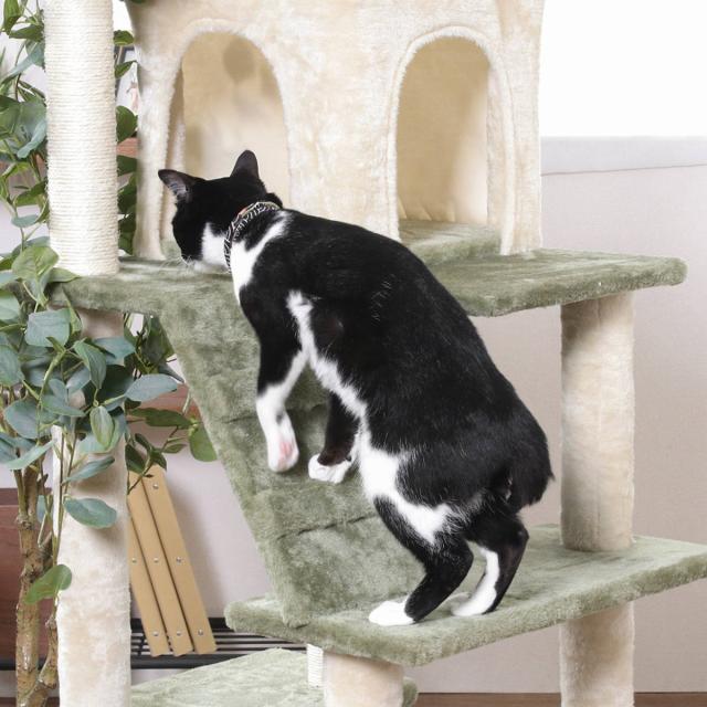 猫ちゃんがうれしい遊び心満載なキャットタワーです。くすみグリーンにホワイトの配色で優しい印象です。