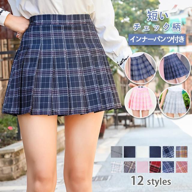ミニスカート レディース スカート プリーツ ミニ 制服 スカート発表会 チェック柄 無地 女子 高校生 定番 インナーパンツ付き Aライン