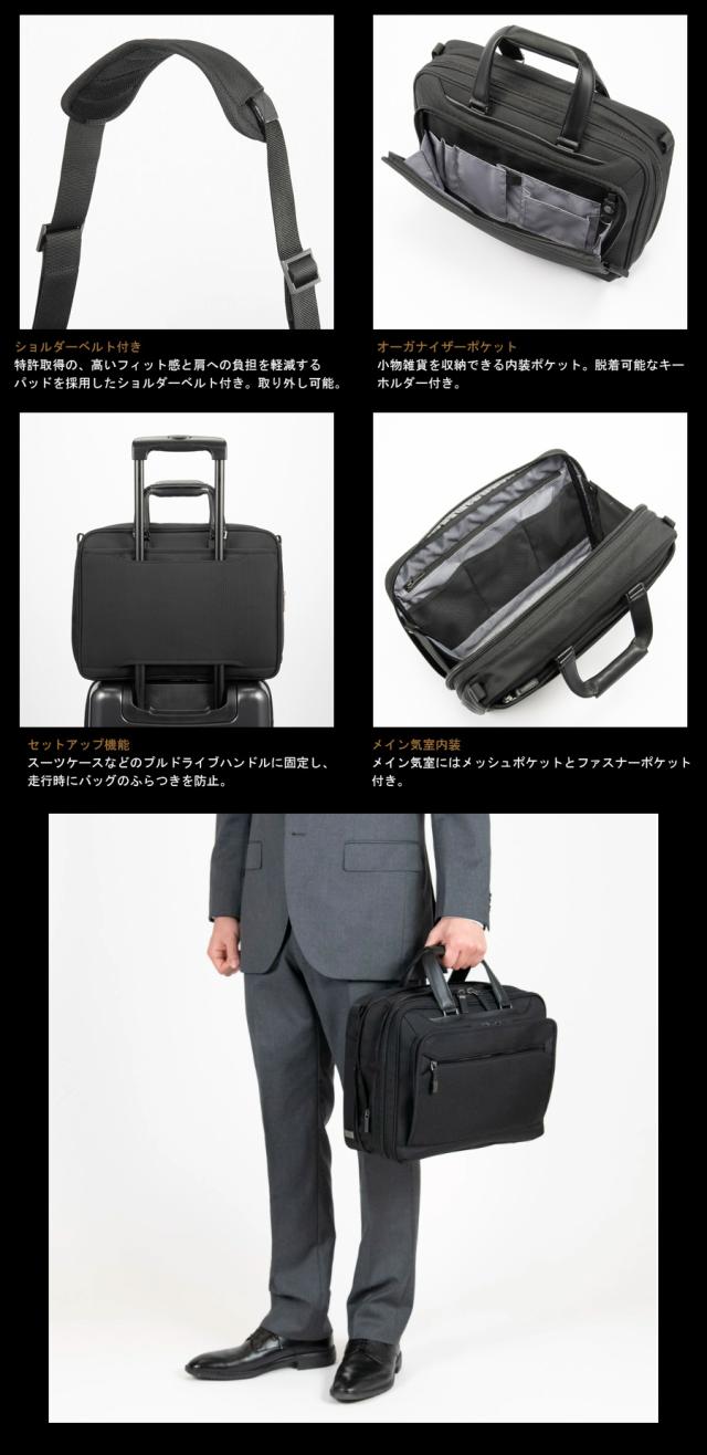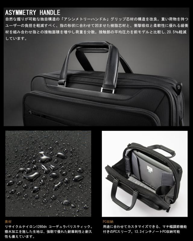 機能一覧:1気室/A4ファイル収納/PC収納(13.3inch)/ショルダーベルト/セットアップ機能/エキスパンダブル(マチ拡張)機能