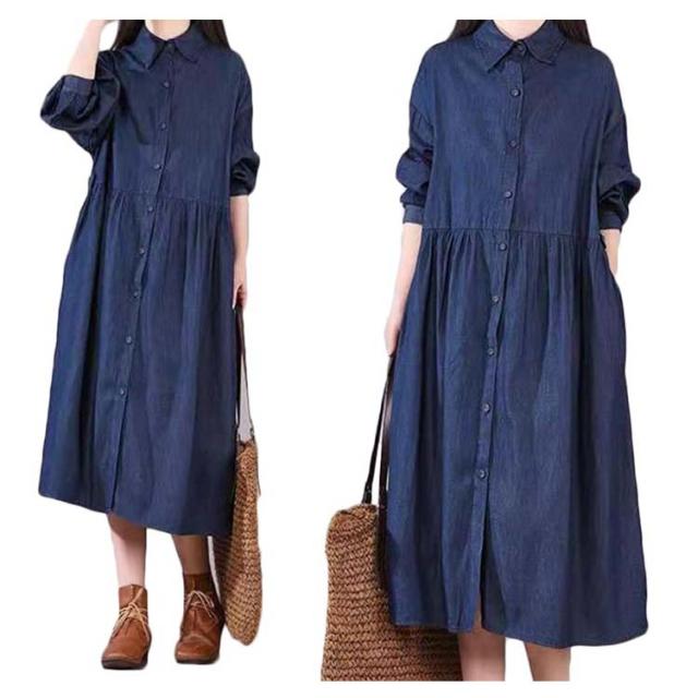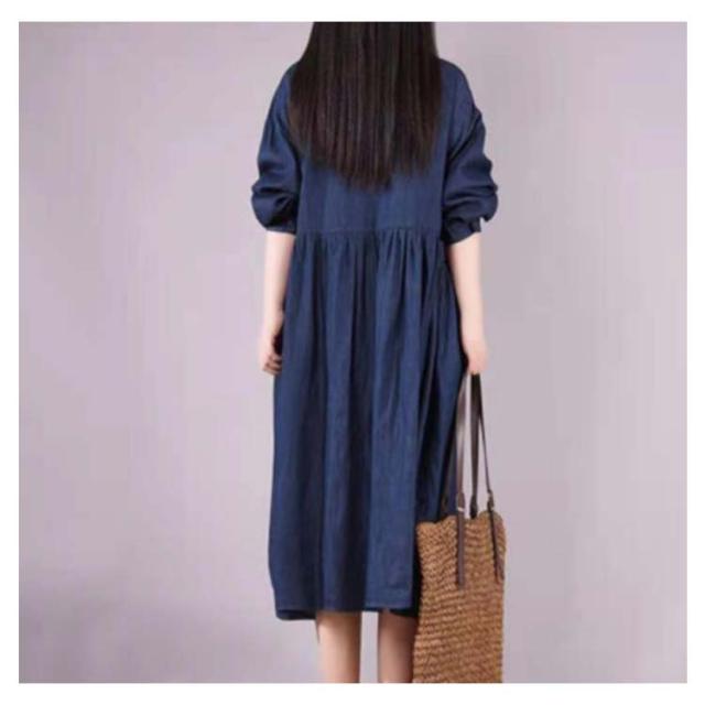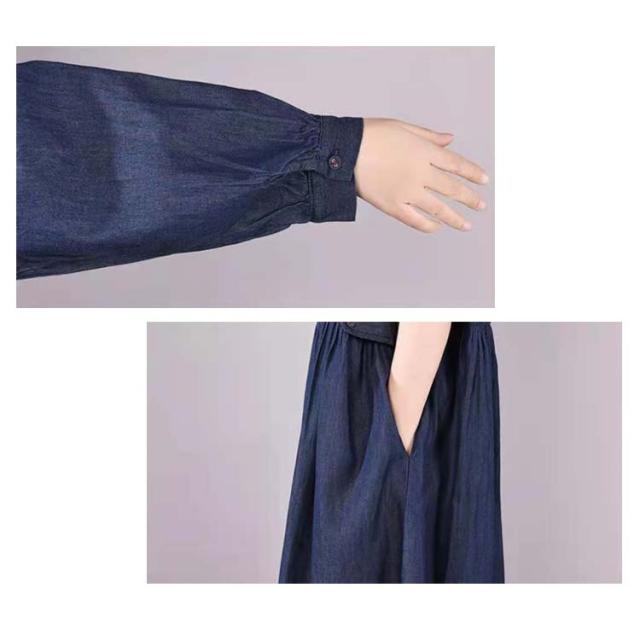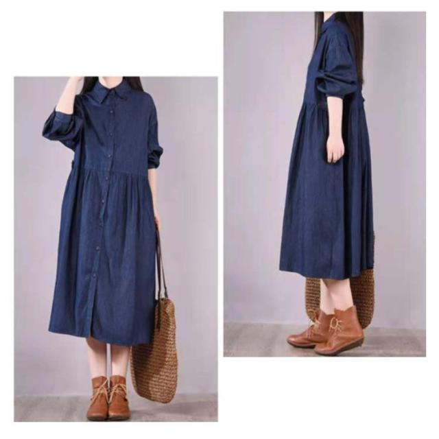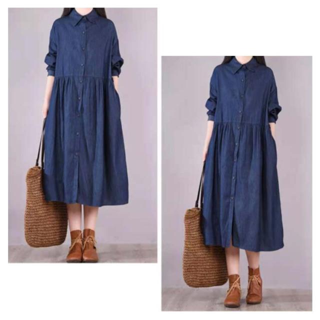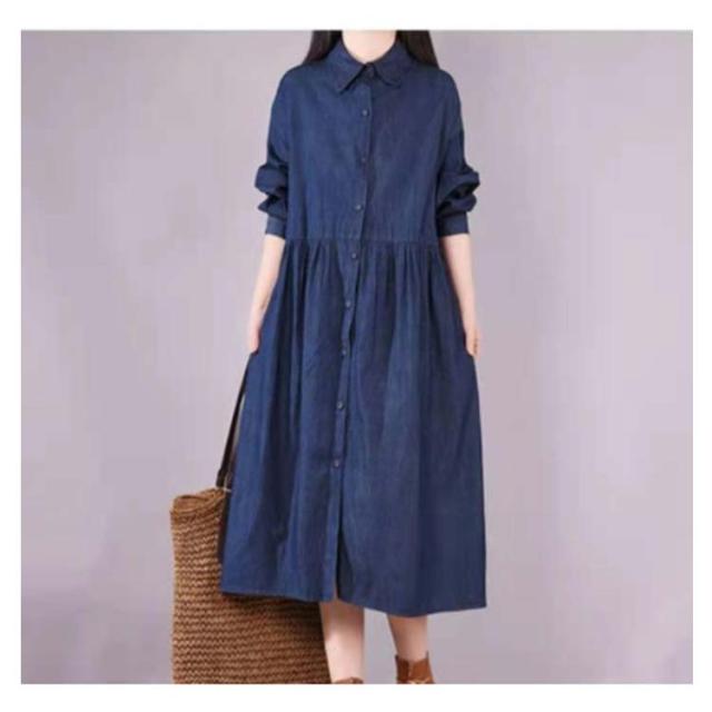 デニムワンピース レディース 無地 長袖ワンピ ロングワンピース シャツワンピース Aライン ミモレ丈 ワンピ フロントボタン 春秋 韓国系 ゆったり 大きサイズ 膝下 カジュアル