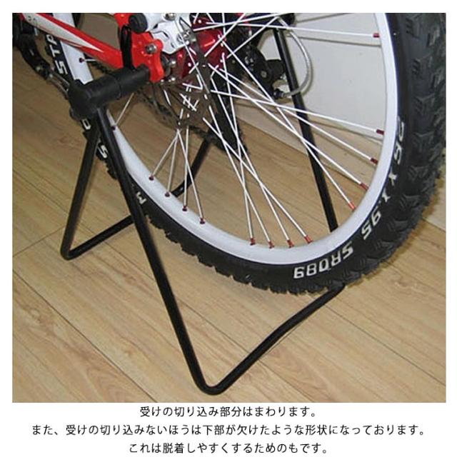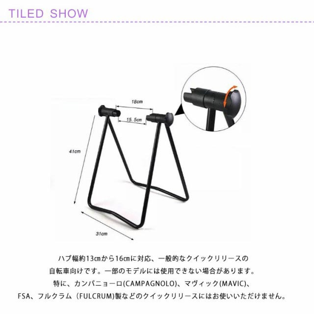 | 自転車展示型スタンドです、メンテナンス時にも大活躍! 後輪ハブを挟みこんで固定する! 保管、展示用に! ハブ幅約13cmから16cmに対応、一般的なクイックリリースの自転車向けです。一部のモデルには使用できない場合があります。特に、カンパニョーロ(CAMPAGNOLO)、マヴィック(MAVIC)、FSA、フルクラム(FULCRUM)製などのクイックリリースにはお使いいただけません。 受けの切り込み部分はまわります。また、受けの切り込みないほうは下部が欠けたような形状になっております。これは脱着しやすくするためのもです。 折りたたみ式で収納便利、両側に調節ボタンがあり、きつさ調節可能。 ご注意:装着した状態で自転車には絶対に乗らないで下さい。 | |