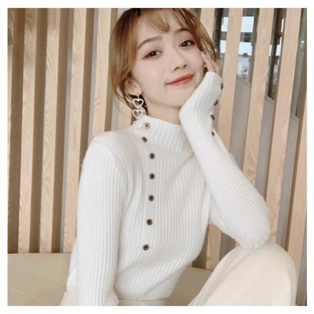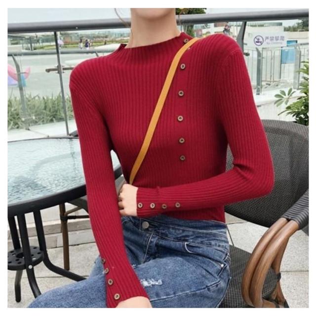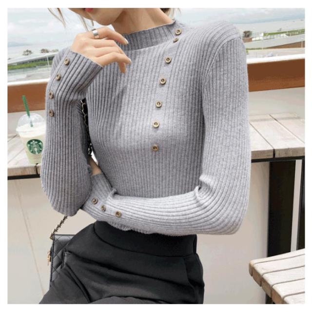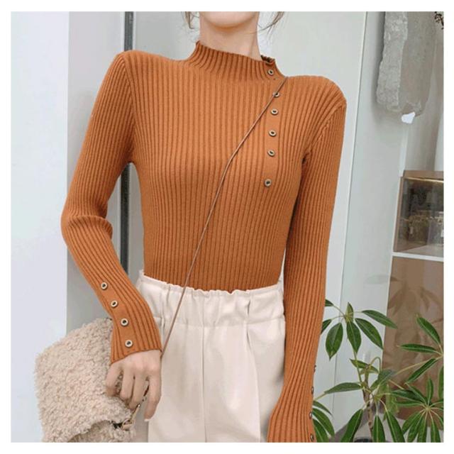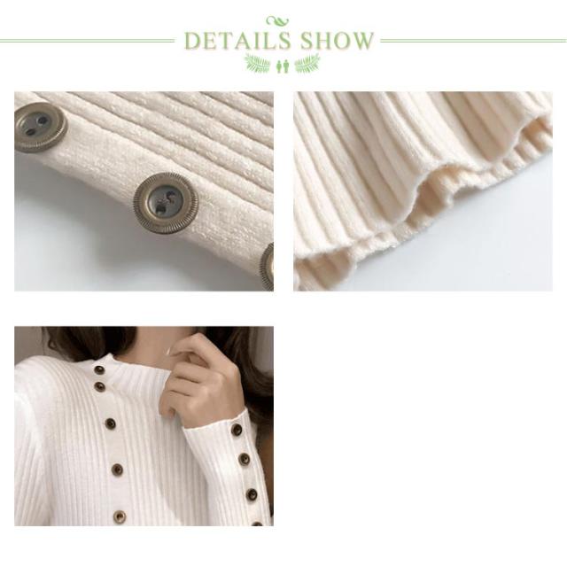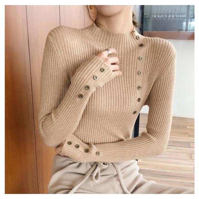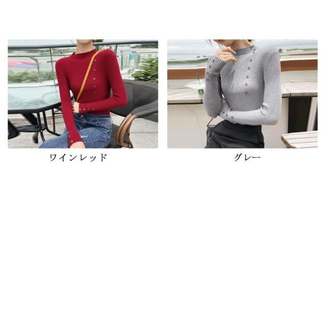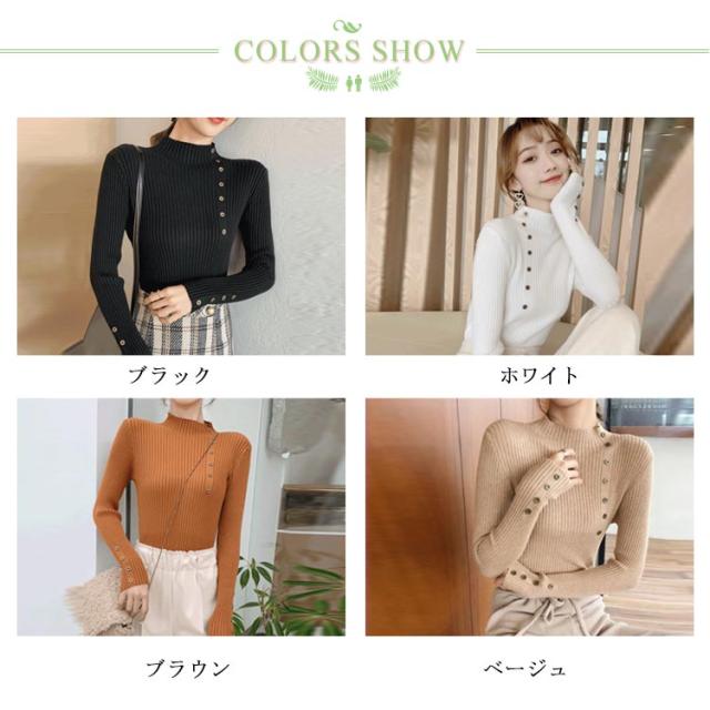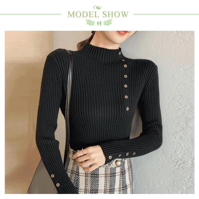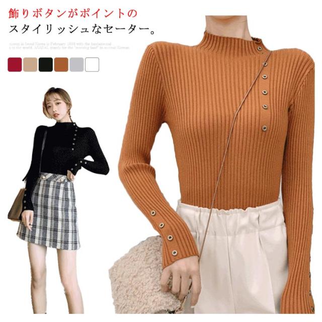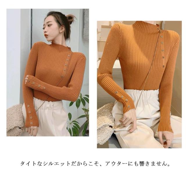 ボタン飾りニットトップス レディース ハイネック リブニット ニット セーター スリム 細身 ボタン付き シンプル 無地 秋 冬 送料無料 S M L XL 2XL