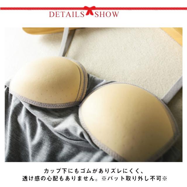 | カップ付きチューブトップタイプのレディーストップスです。 身生地はモーダルレーヨン素材で着心地柔らか♪ カップ下にもゴムがありズレにくく、透け感の心配もありません。※パット取り外し不可※ 長さ調節の出来るストラップは取り外し可能なので、首や肩回りをスッキリ見せることが出来ます! しなやかな伸縮ゴムを採用することで胸囲に食い込まず、締め付けのストレスが少ないベアトップが完成しました。 涼し気なトップスとしても肩回りが開いたワンピースやドレスのインナーとしてもOK、ダンスやヨガ・エクササイズのウェアとしもお薦めです! | |