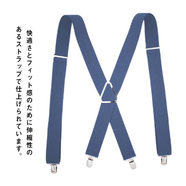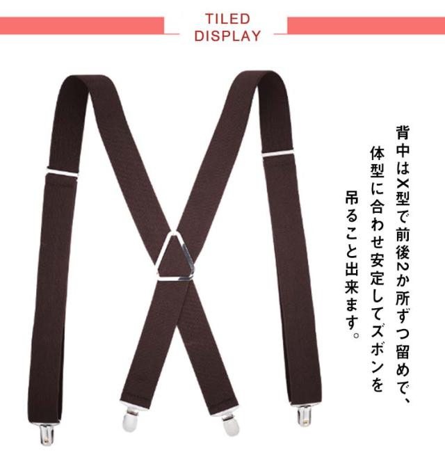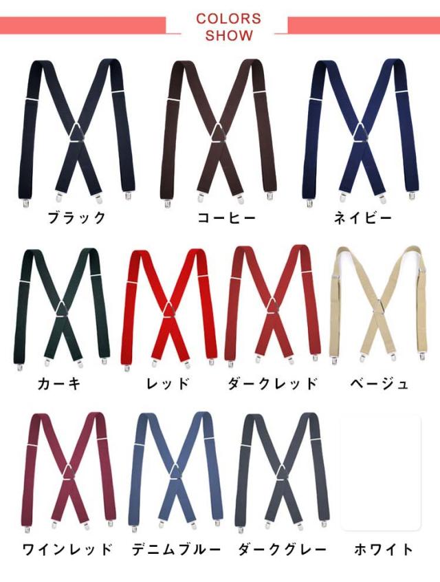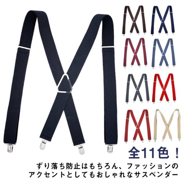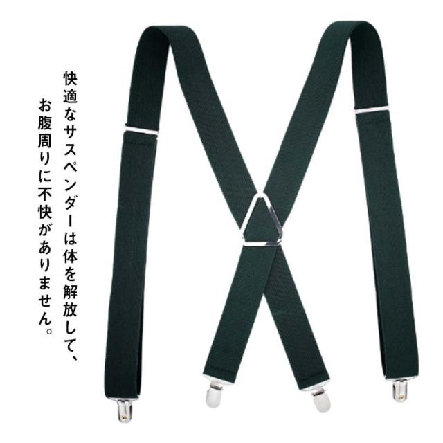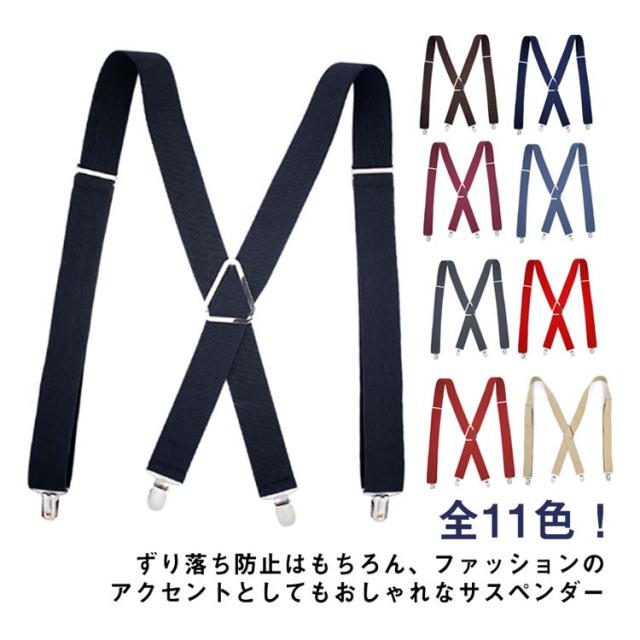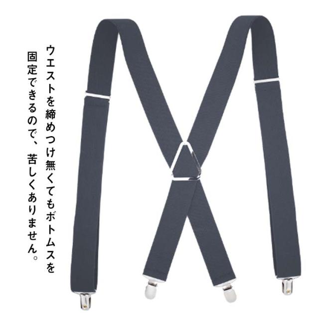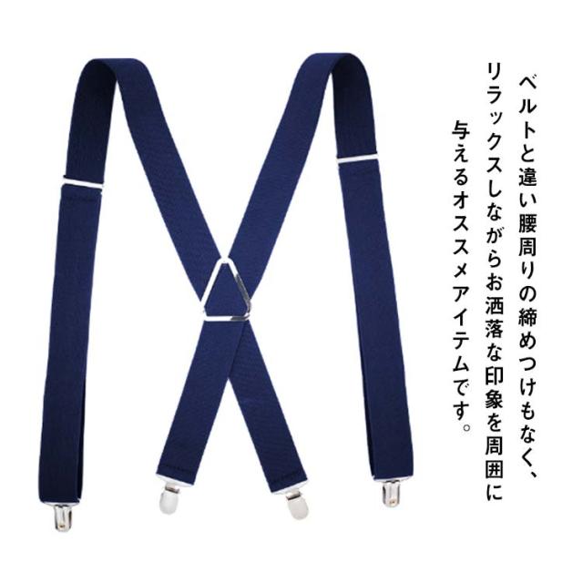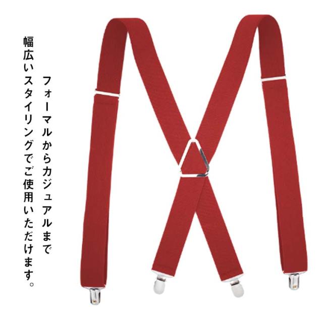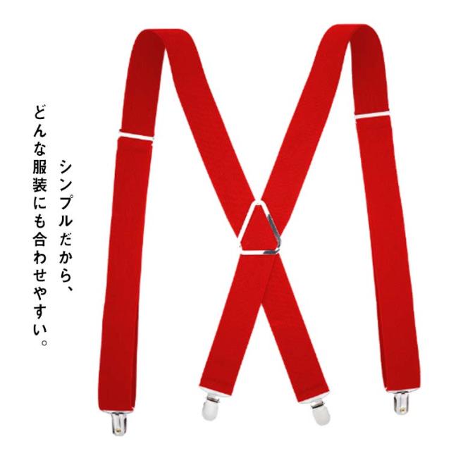 | 全11色!ずり落ち防止はもちろん、ファッションのアクセントとしてもおしゃれなサスペンダー。 背中はX型で前後2か所ずつ留めで、体型に合わせ安定してズボンを吊ること出来ます。 ベルトと違い腰周りの締めつけもなく、リラックスしながらお洒落な印象を周囲に与えるオススメアイテムです。 快適さとフィット感のために伸縮性のあるストラップで仕上げられています。 ウエストを締めつけ無くてもボトムスを固定できるので、苦しくありません。 快適なサスペンダーは体を解放して、お腹周りに不快がありません。 シンプルだから、どんな服装にも合わせやすい。 フォーマルからカジュアルまで幅広いスタイリングでご使用いただけます。 | |