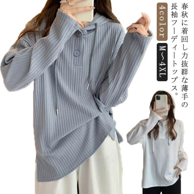 カットソー レディース パーカー トップス スウェット 長袖 フード付き 長袖 Tシャツ 薄手 快適 サイドスリット プルオーバー ロング丈 体型カバー ゆったり カジュアル 無地 シンプル 春夏秋