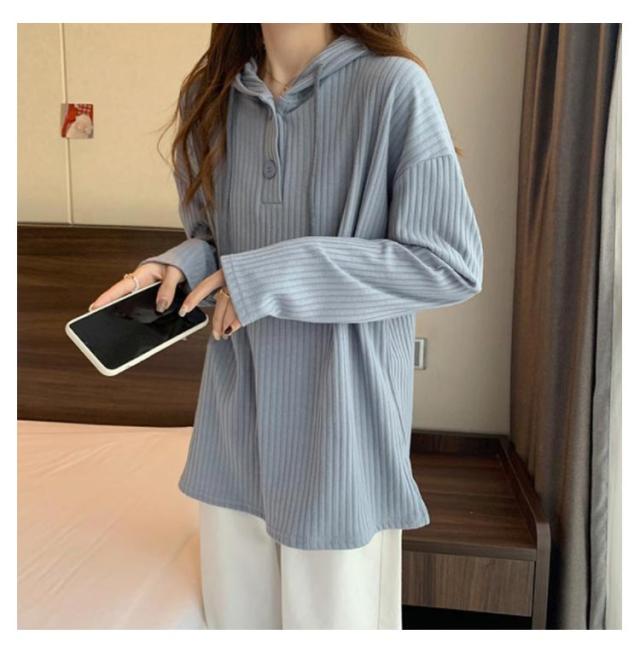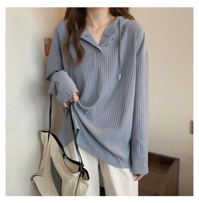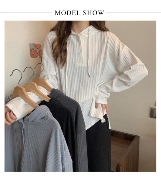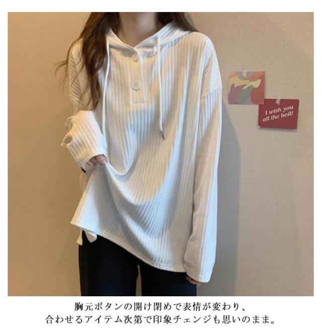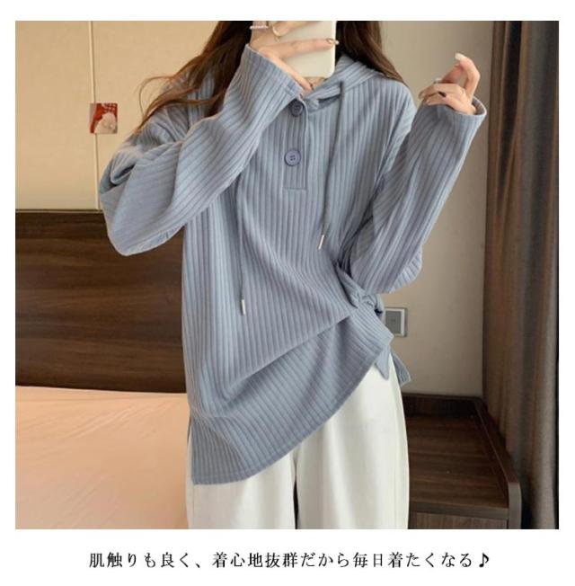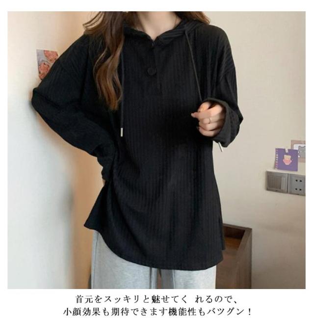 | 春秋に着回し力抜群な薄手の長袖フーディートップス。 胸元ボタンの開け閉めで表情が変わり、合わせるアイテム次第で印象チェンジも思いのまま。 首元をスッキリと魅せてく れるので、小顔効果も期待できます機能性もバツグン! 肌触りも良く、着心地抜群だから毎日着たくなる♪ | |